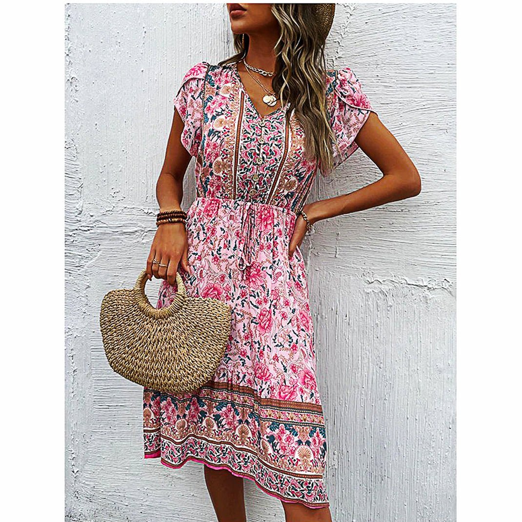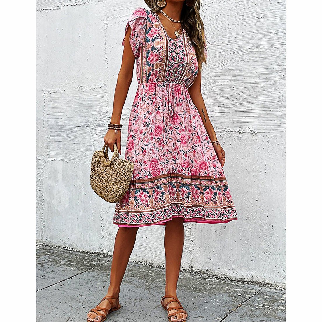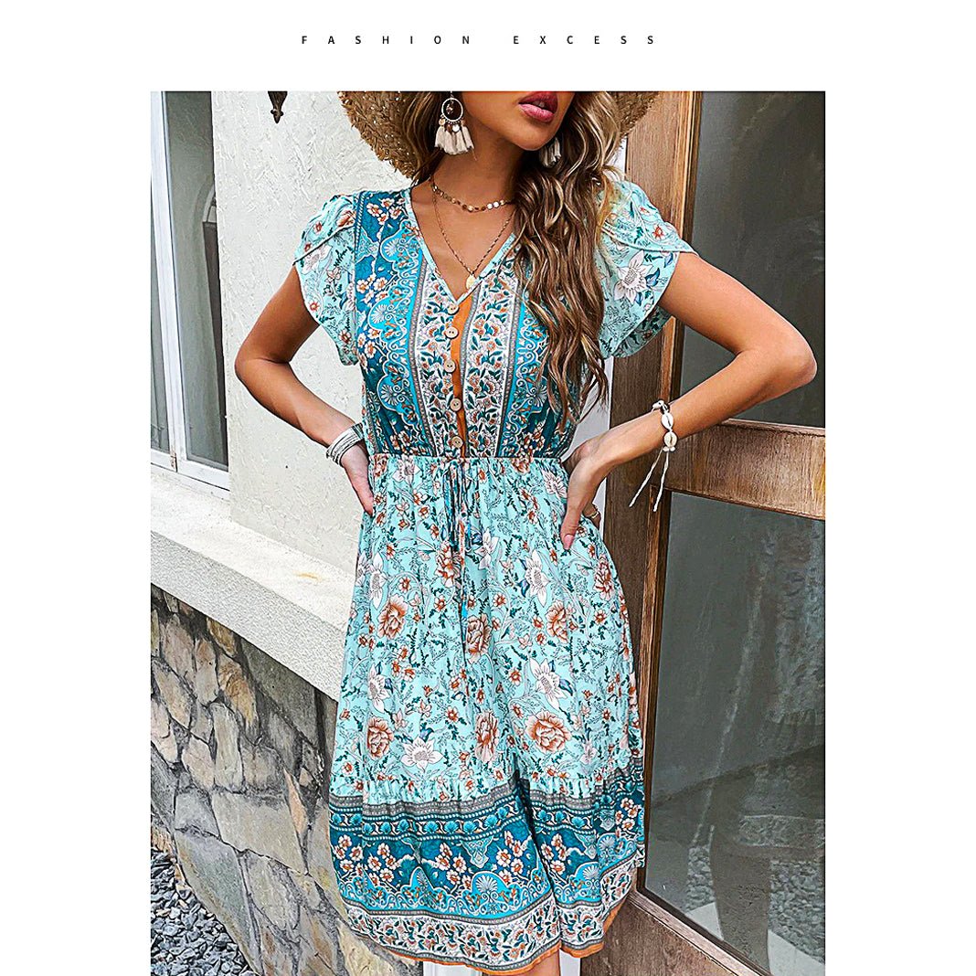 Flowy Pantsuit Green Floral Print Boho Elegant Short Petal Sleeve Dresses Party Vacation Beach Outfits D393