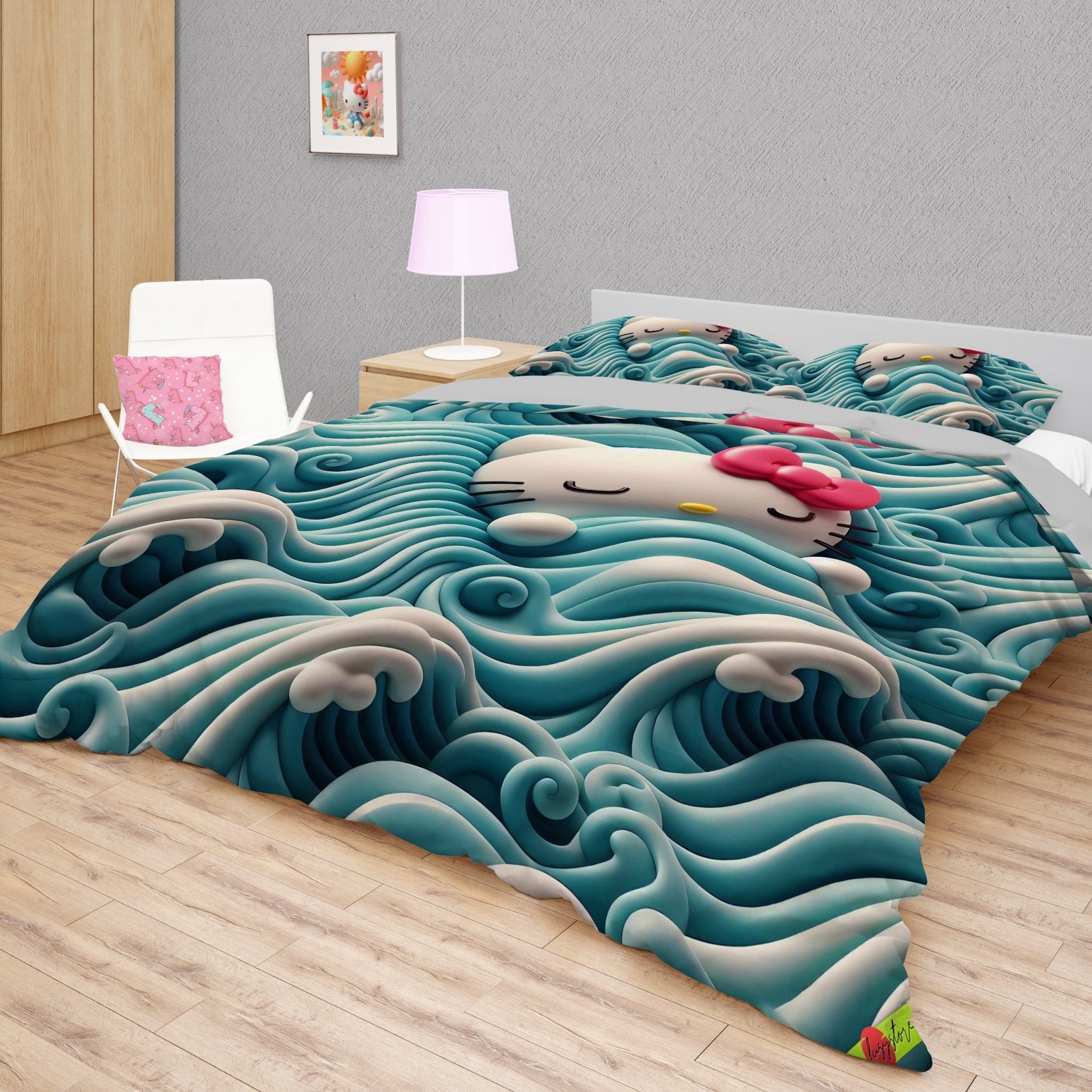 Introduce a touch of cuteness and quality to your bedroom with our Hello Kitty bedding set. Made from high-quality linen fabric, this blue bedding set features a 3D image of the iconic Hello Kitty sleeping peacefully amidst waves. The set includes a duvet cover and pillowcase, ensuring a comfortable and stylish sleep experience.