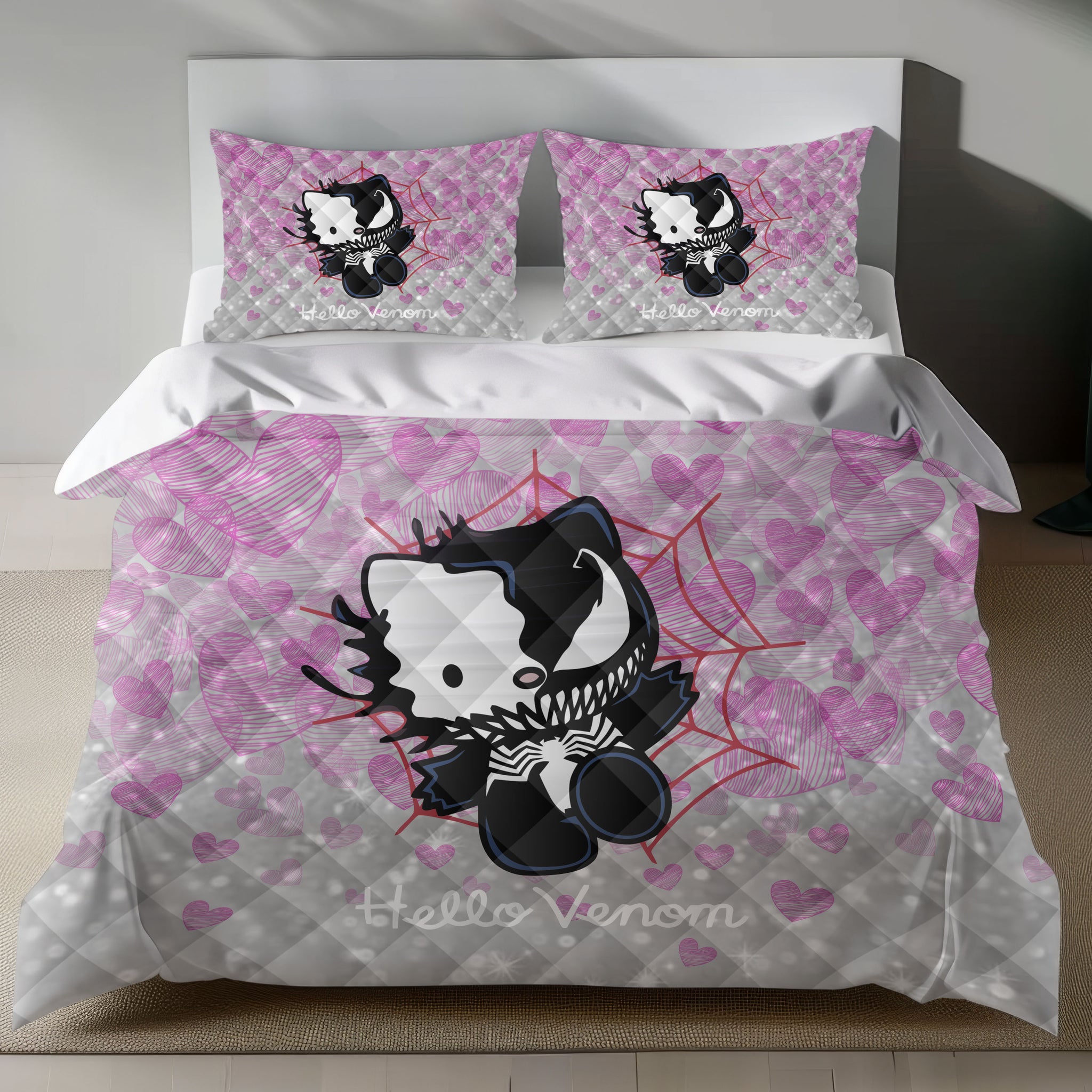 This bedding set features Hello Kitty as Venom, with a black symbiote design, spider emblem, and her signature red bow. A red spider web accents the background, set against a shimmering silver backdrop with intricate pink heart patterns. The words "Hello Venom" are playfully displayed below, making this set a perfect blend of kawaii charm and Marvel’s dark antihero vibe for fans of Sanrio and Venom.