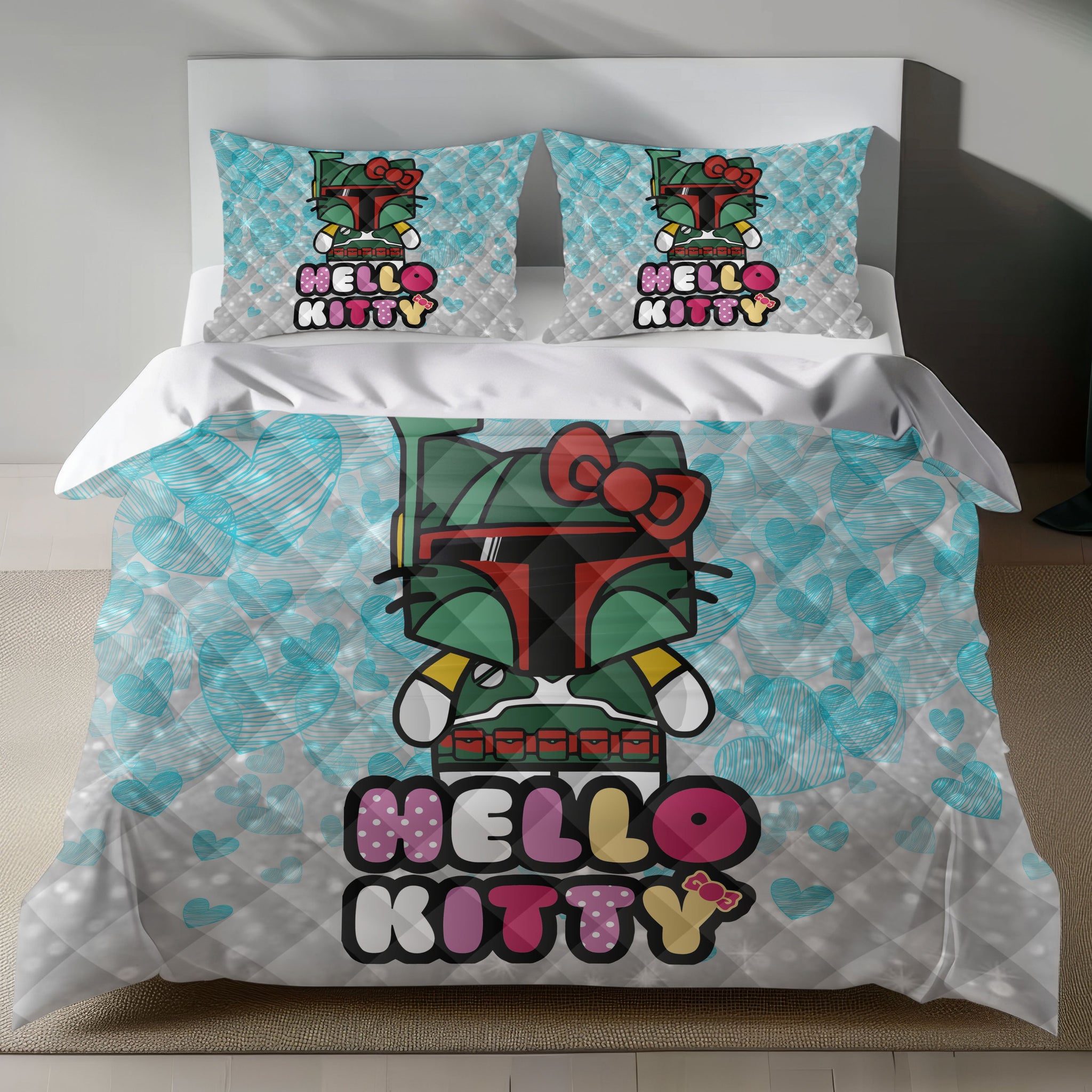 This bedding set features an adorable Hello Kitty dressed as Boba Fett, complete with his iconic green and red Mandalorian armor, helmet, and a pink bow. Set against a shimmering silver background with intricate blue heart patterns, the words "HELLO KITTY" are playfully displayed below. This design merges kawaii charm with Star Wars legacy, making it a perfect addition for fans of both Sanrio and the galaxy far, far away.