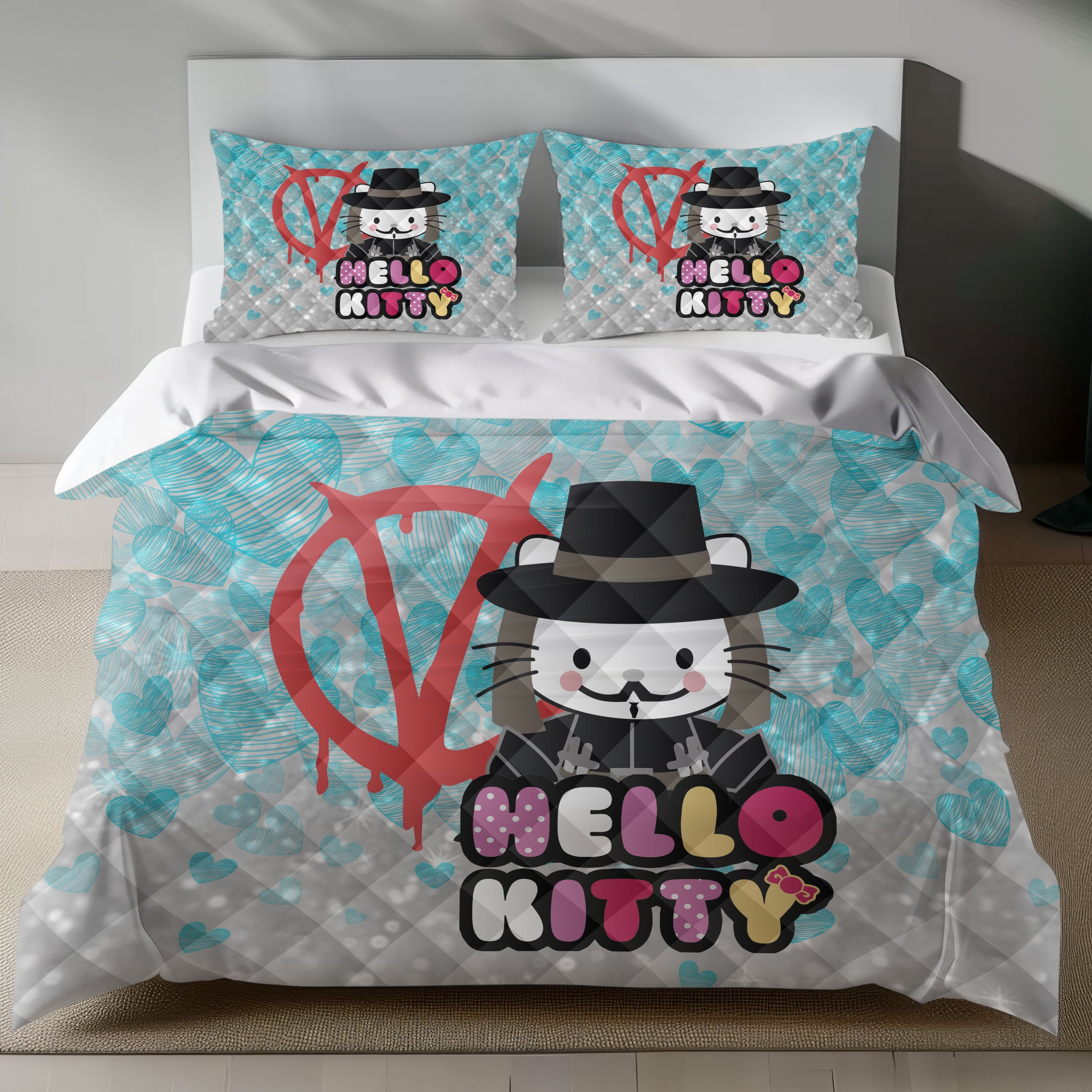 This bedding set showcases a striking Hello Kitty design, featuring the beloved Sanrio character dressed as V from V for Vendetta, complete with a black hat, cape, and mask. A bold red "V" symbol adds a rebellious touch, set against a shimmering silver background with intricate blue heart patterns. The words "HELLO KITTY" are playfully displayed below, making this set a perfect fusion of cute and edgy, ideal for fans who love a unique bedroom aesthetic.