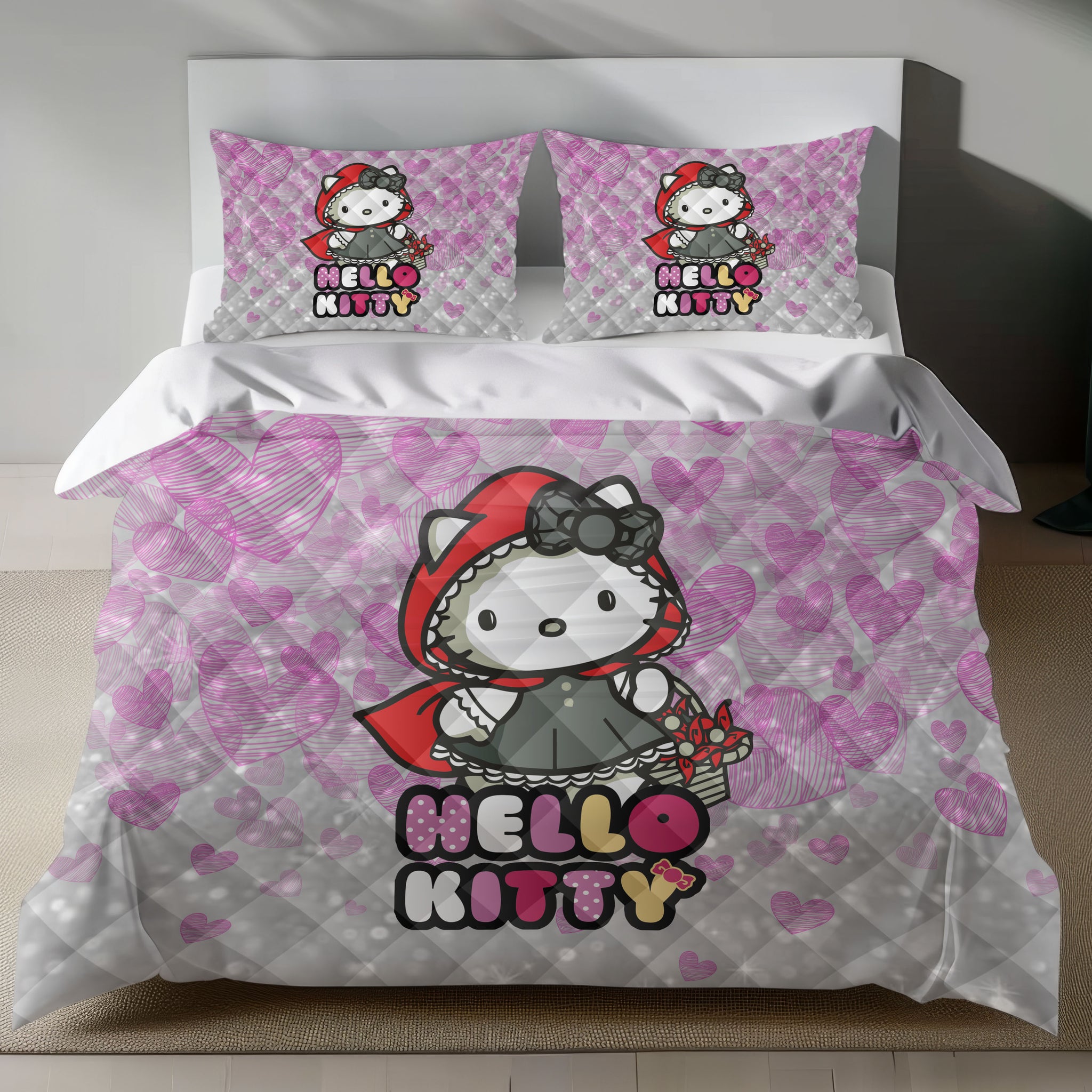 This bedding set features Hello Kitty as Little Red Riding Hood, complete with a red hooded cape, a basket of flowers, and her signature bow. Set against a shimmering silver background with intricate pink heart patterns, the words "HELLO KITTY" are playfully displayed below. This design merges kawaii charm with fairytale magic, making it a perfect addition for fans of Sanrio and classic stories.