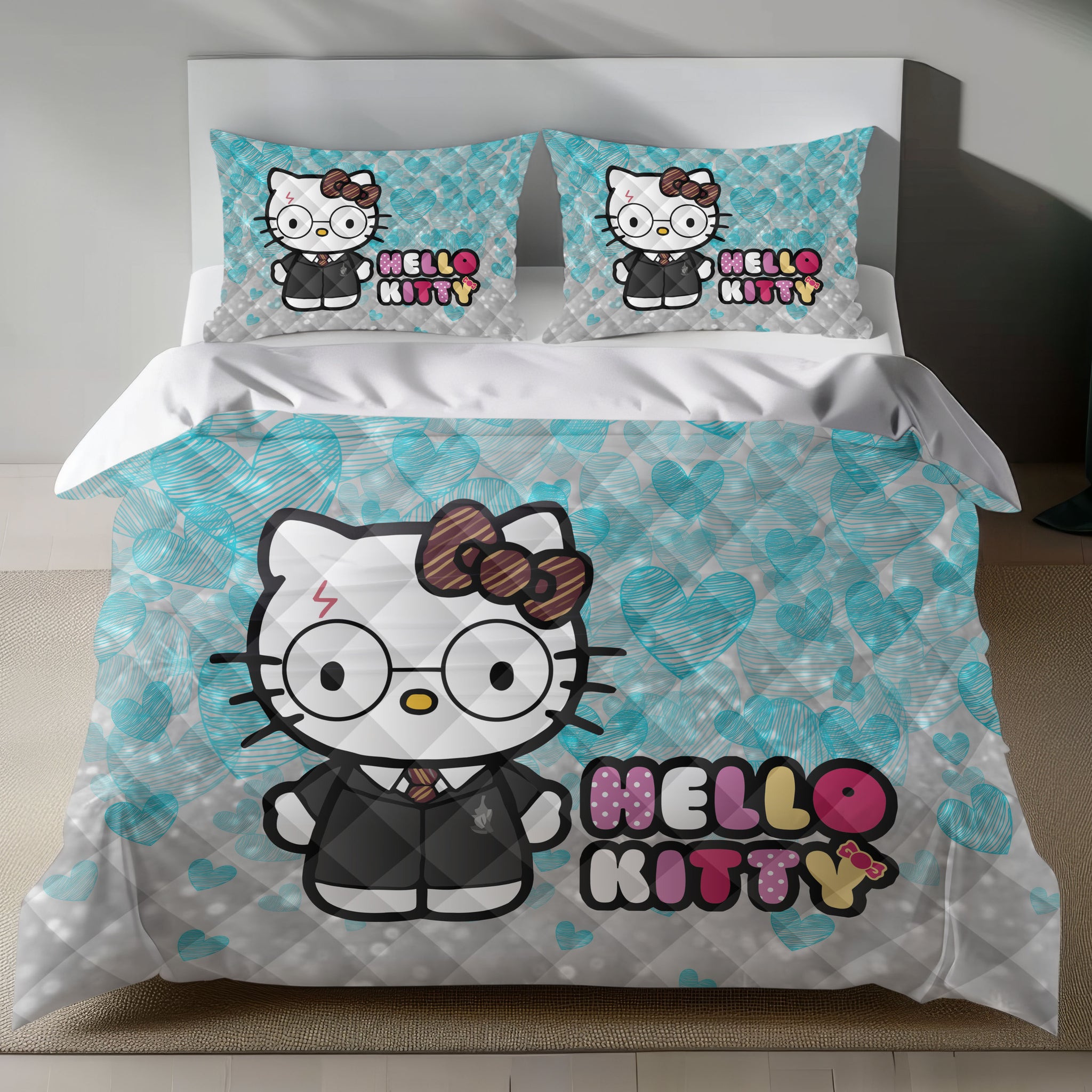 This bedding set features an adorable Hello Kitty dressed in a Hogwarts-inspired uniform, complete with glasses, a lightning scar, and a striped tie. The words "HELLO KITTY" are playfully displayed below, set against a shimmering silver background with intricate blue heart patterns. This unique design combines kawaii charm with magical flair, making it a perfect addition to any fan’s bedroom or a thoughtful gift for kids and teens.