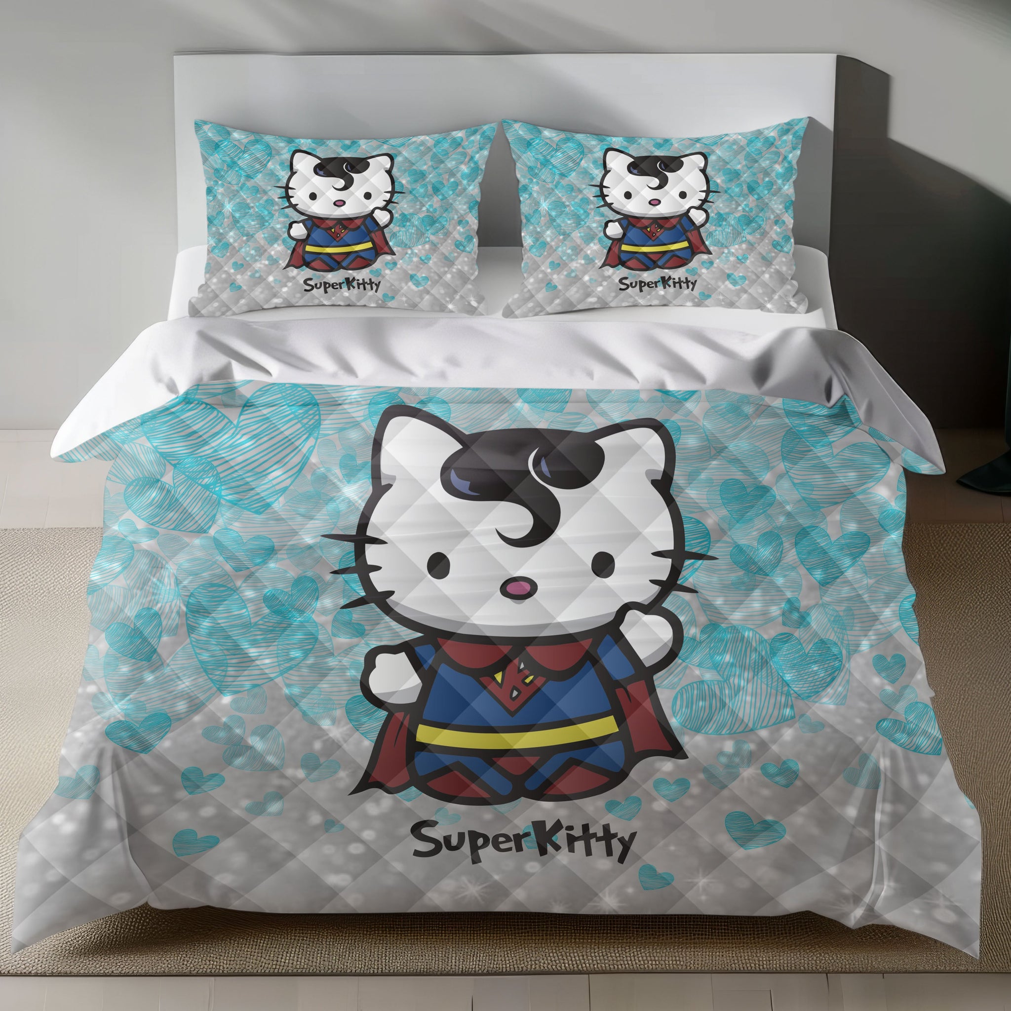 This bedding set features an adorable Hello Kitty dressed as a superhero, complete with a red cape, blue suit, and a black curl on her forehead. Set against a shimmering silver background with intricate blue heart patterns, the words "SuperKitty" are playfully displayed below. This design merges kawaii charm with heroic flair, making it a perfect addition for fans of both Sanrio and superhero themes.