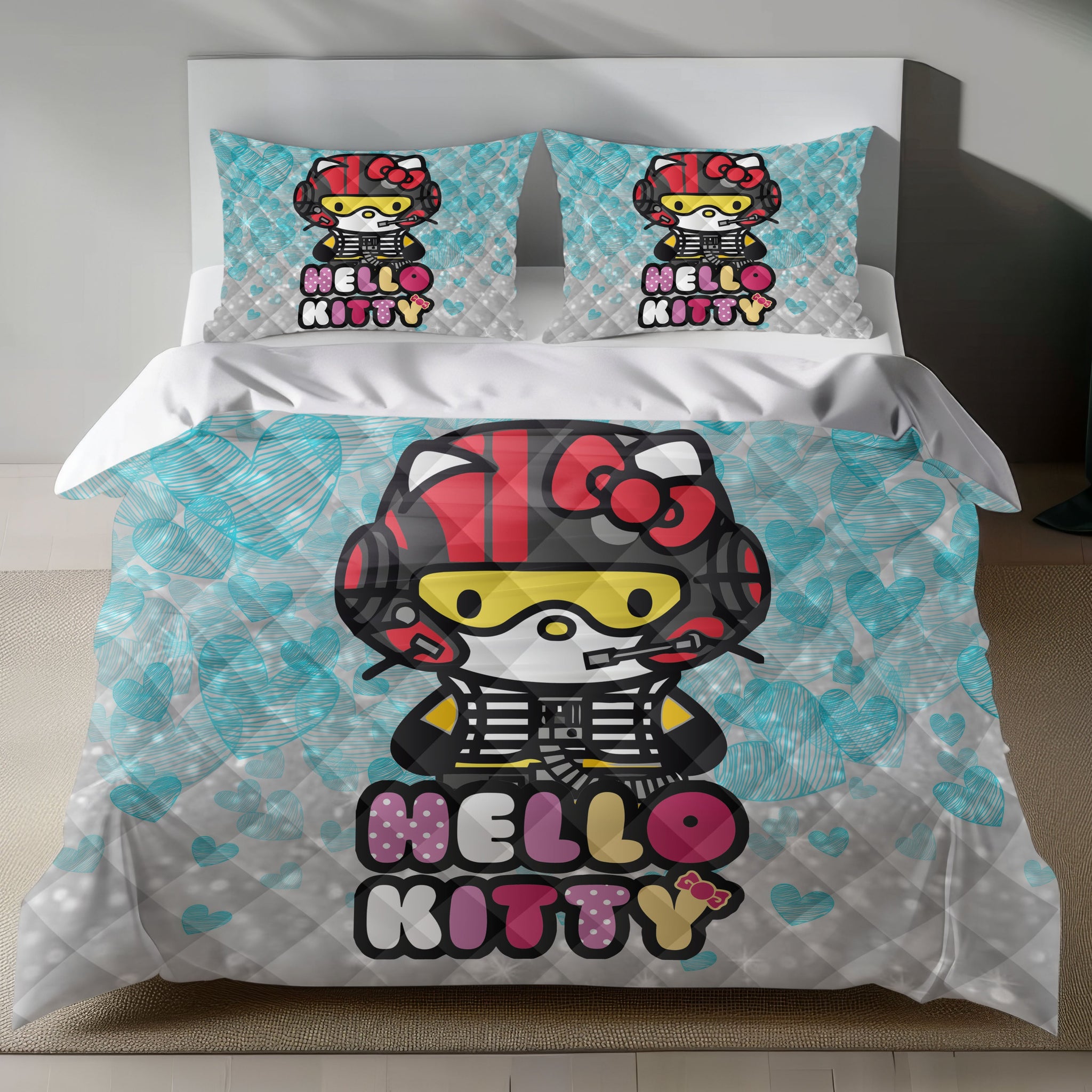 This bedding set features an adorable Hello Kitty dressed as a Formula 1 racer, complete with a racing helmet, red suit, and her signature bow. Set against a shimmering silver background with intricate blue heart patterns, the words "HELLO KITTY" are playfully displayed below. This design merges kawaii charm with racing energy, making it a perfect addition for fans of both Sanrio and Formula 1.