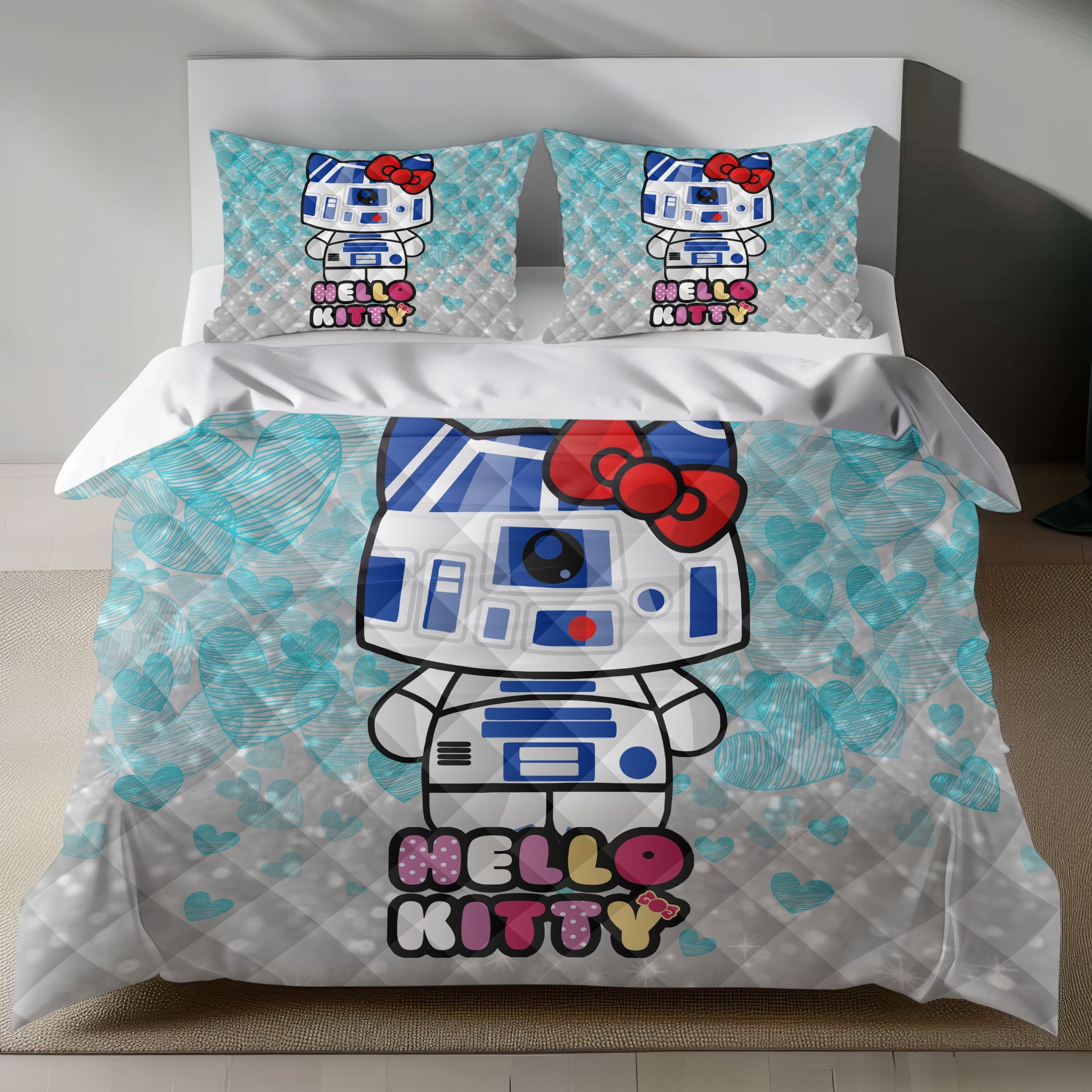 This bedding set features an adorable Hello Kitty transformed into R2-D2, the beloved Star Wars droid, with her signature red bow atop the blue and white droid design. Set against a shimmering silver background with intricate blue heart patterns, the words "HELLO KITTY" are playfully displayed below. This design merges kawaii charm with sci-fi adventure, making it a perfect addition for fans of both Sanrio and Star Wars.