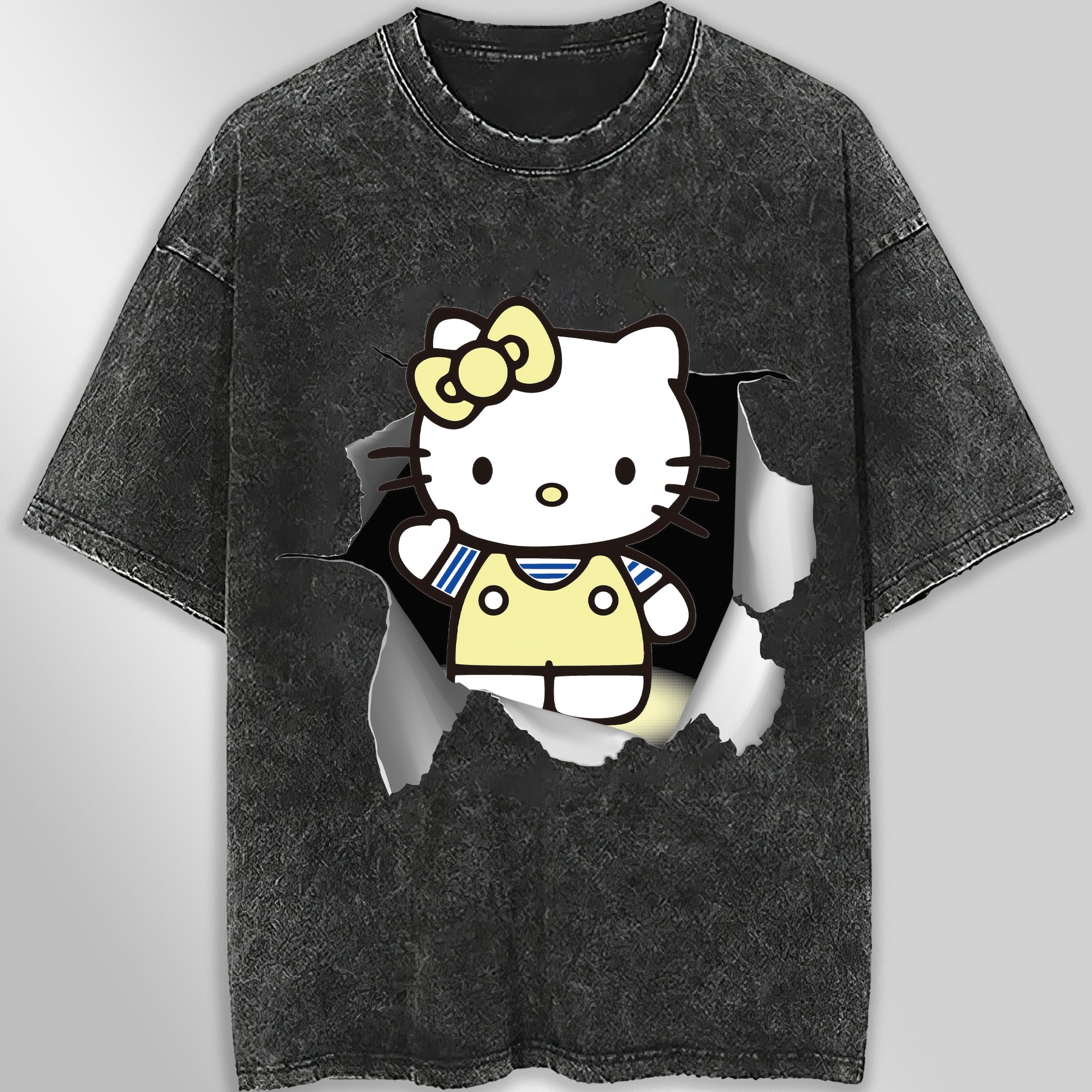 This unisex tee shirt features a cute and funny graphic of Hello Kitty, perfect for any fan of the popular character. With a wide sleeve style, it offers a comfortable fit for both men and women. Add a touch of whimsy to your wardrobe with this adorable tee.