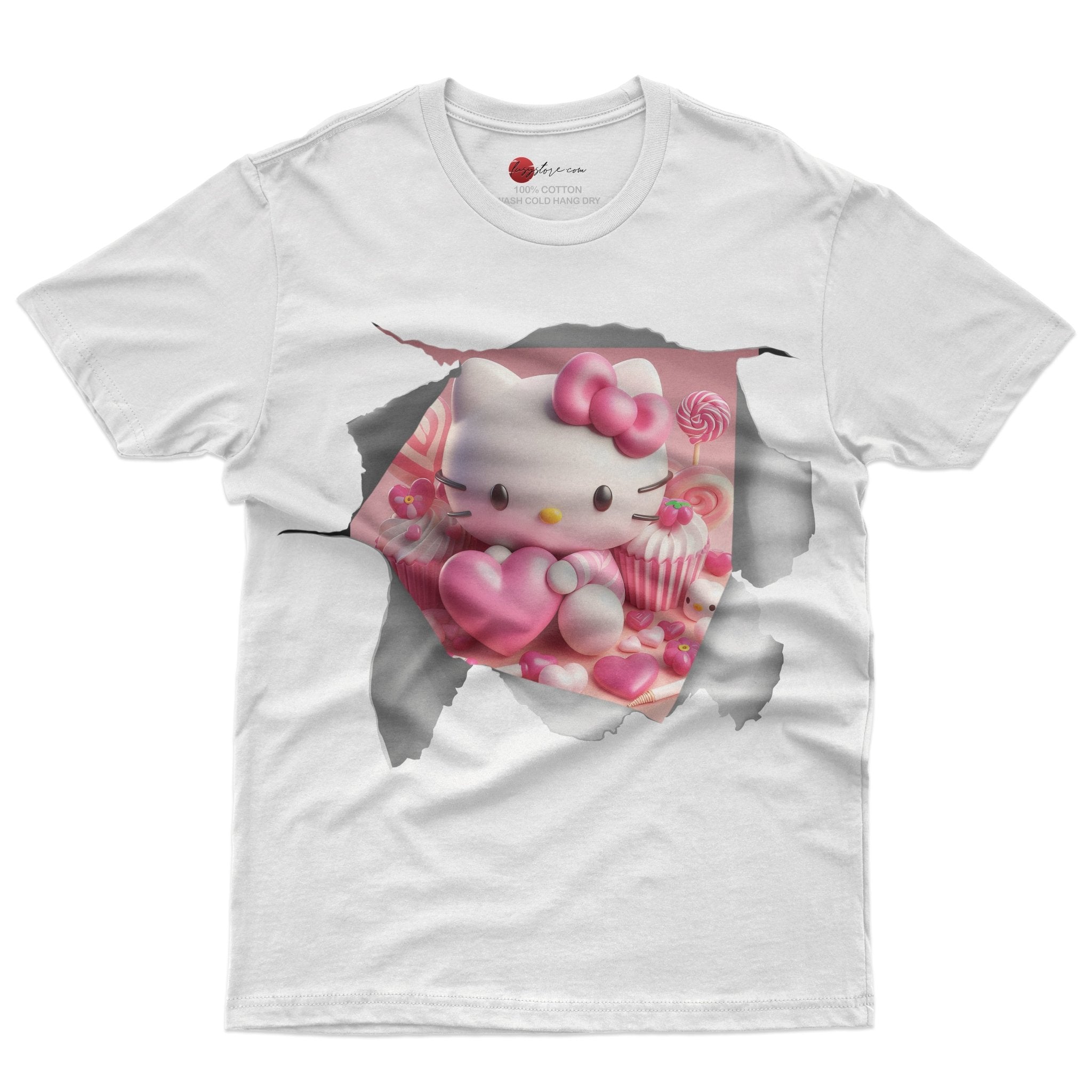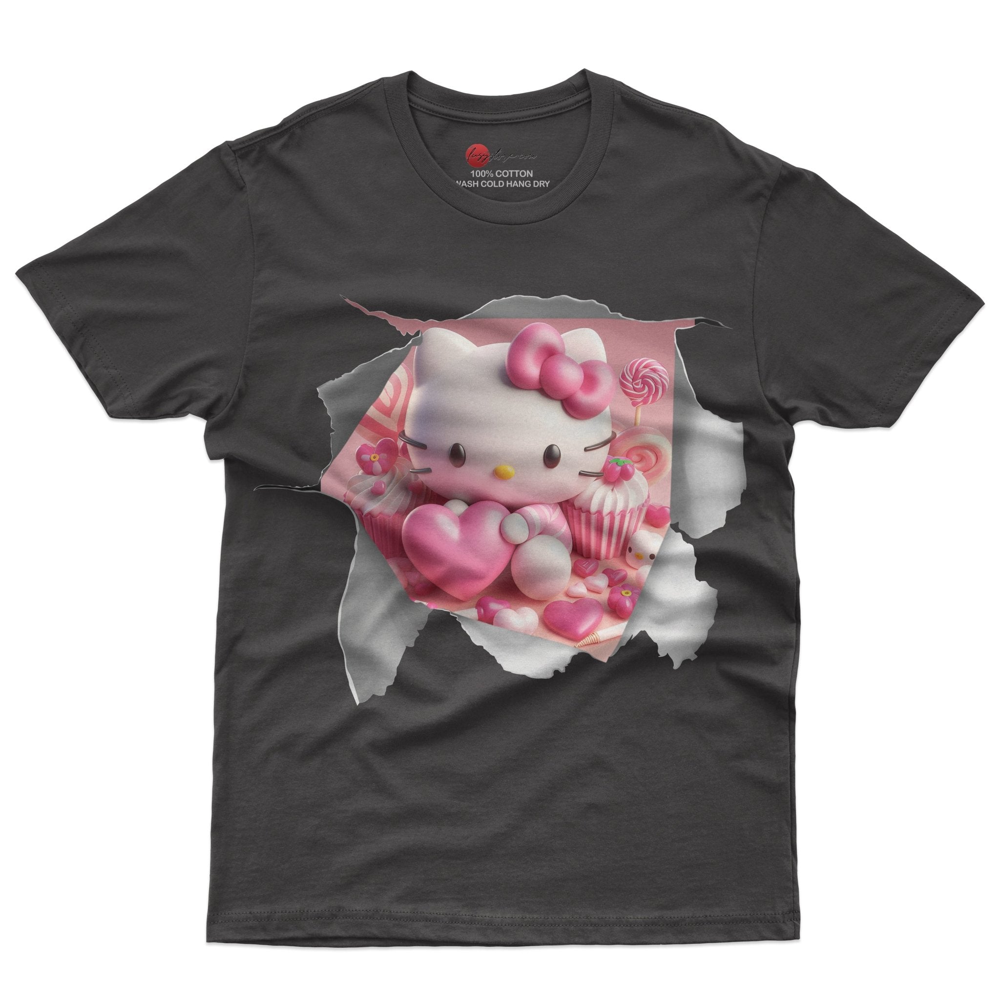 This unisex novelty cotton tee shirt features a cute Hello Kitty design with a heart graphic. Made with high quality cotton, it offers both comfort and style. Perfect for Hello Kitty fans, this tee combines fun and fashion.