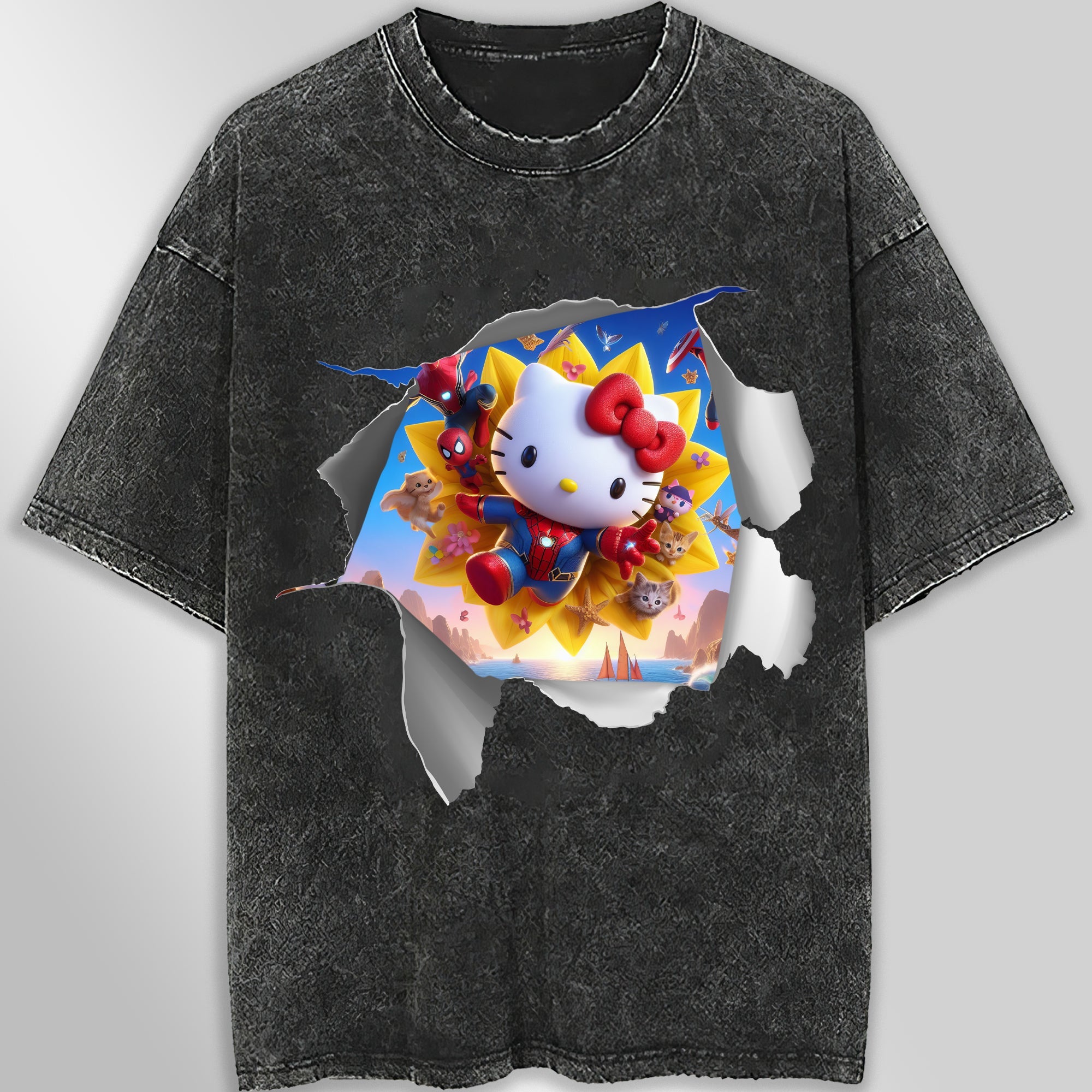 Immerse yourself in superhero cuteness with this unisex Hello Kitty tee shirt. Featuring a funny Spiderman version of the beloved character, this tee is designed with wide sleeves for ultimate comfort. Show off your love for Hello Kitty and comic book heroes in one stylish and unique graphic tee.