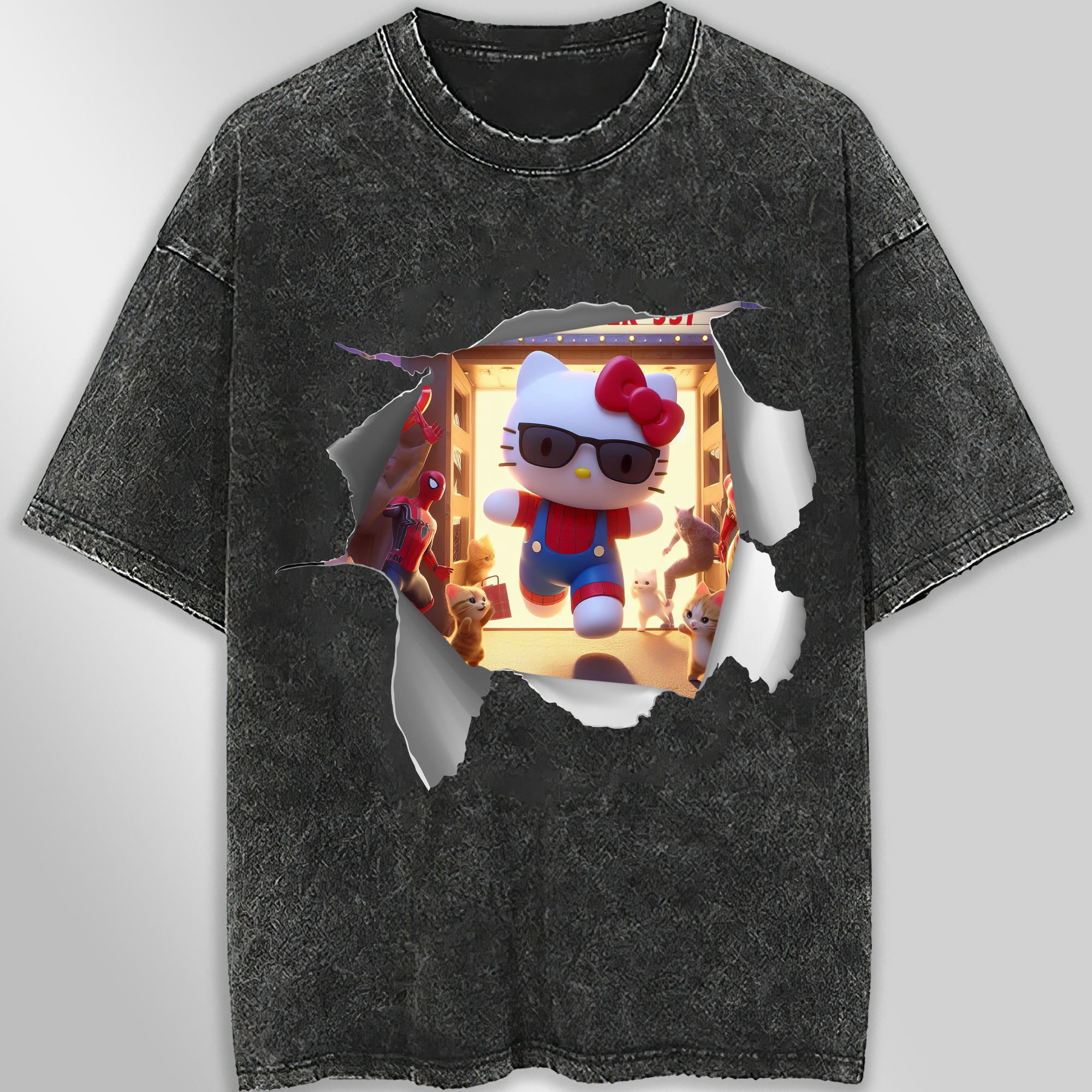 Expertly designed for your inner nerd and fashion-forward style, this Hello Kitty tee features a hilarious Spiderman-inspired graphic and comfortable unisex wide sleeves. Channel the best of both worlds with this unique and eye-catching tee.