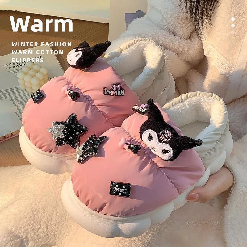 Stay cozy and stylish with our Kuromi Slippers! Made with warm cotton and plush material, these slippers are perfect for indoor and outdoor wear. The anti-slip design ensures safety while the cute Kuromi motif adds a touch of playfulness. Stay comfortable and fashionable with our slippers!