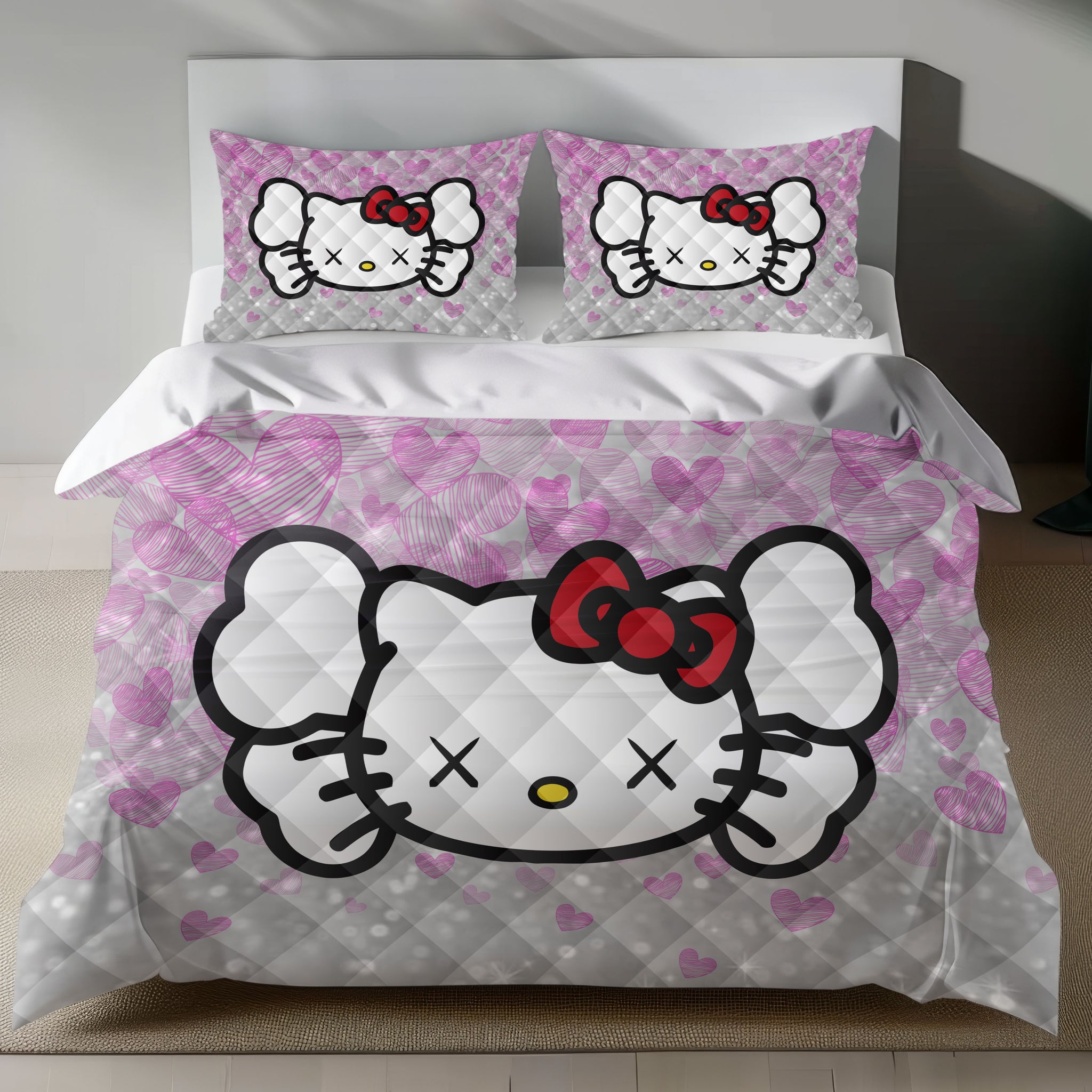 This bedding set features Hello Kitty in the signature KAWS style, with crossed-out eyes, white gloves, and her classic red bow. Set against a shimmering silver background with intricate pink heart patterns, this design merges kawaii charm with street art flair, making it a perfect addition for fans of both Sanrio and contemporary art.