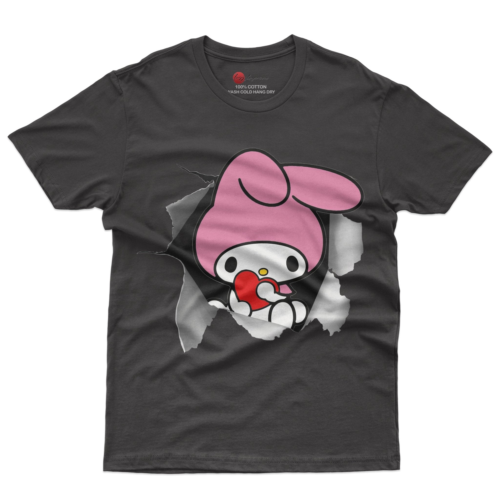 Unisex novelty cotton t shirt featuring a cute and funny graphic design of My Melody. Made from high-quality cotton for comfort and durability. Perfect for those who love unique and playful tees. Expertly crafted for your enjoyment.