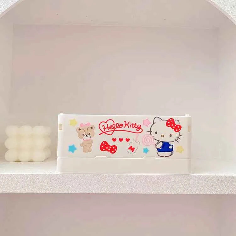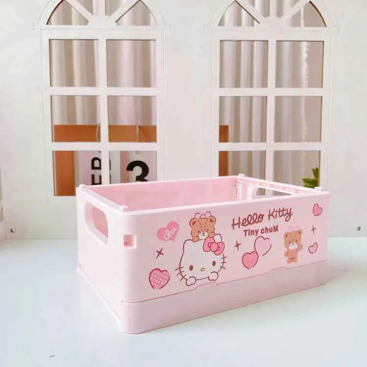 Keep your desktop neat and charming with this Sanrio-themed storage box featuring Hello Kitty, My Melody, Kuromi, and Cinnamoroll designs. Foldable and stackable, it offers versatile organization for cosmetics and small items, helping you save space while adding a cute touch to your workspace. Durable and easy to use, it makes tidying up simple and enjoyable.