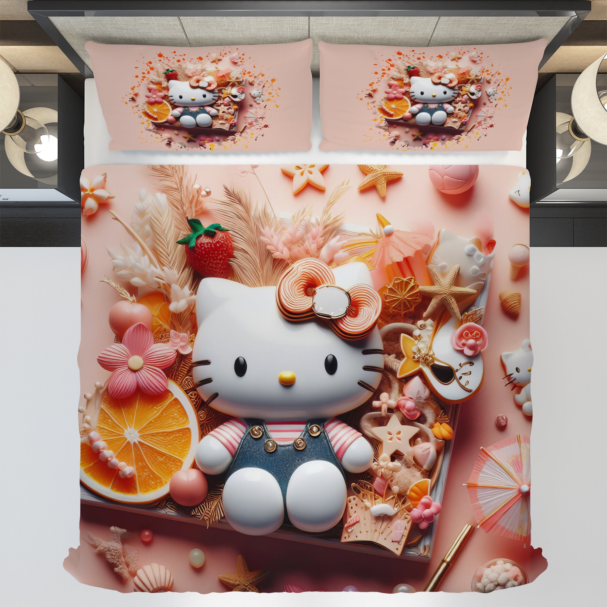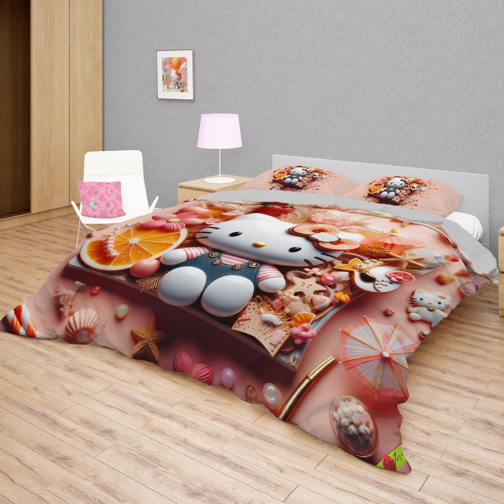 Elevate your bedroom with our Summer bedding set featuring a 3D Hello Kitty design. This cute duvet cover and pillowcase set is perfect for warm weather, providing a cozy and stylish touch to your room. Made with high-quality materials, it offers both comfort and charm.