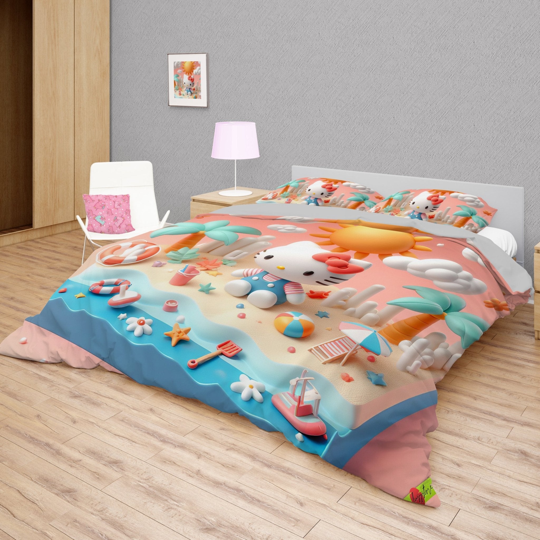 Transform your bedroom into a summer sanctuary with our Hello Kitty 3D bed linen set. Made from high-quality materials, this bedding set features a vibrant and cute Hello Kitty design on a breathable duvet cover and pillowcase. Elevate your bedroom with this charming and comfortable addition.