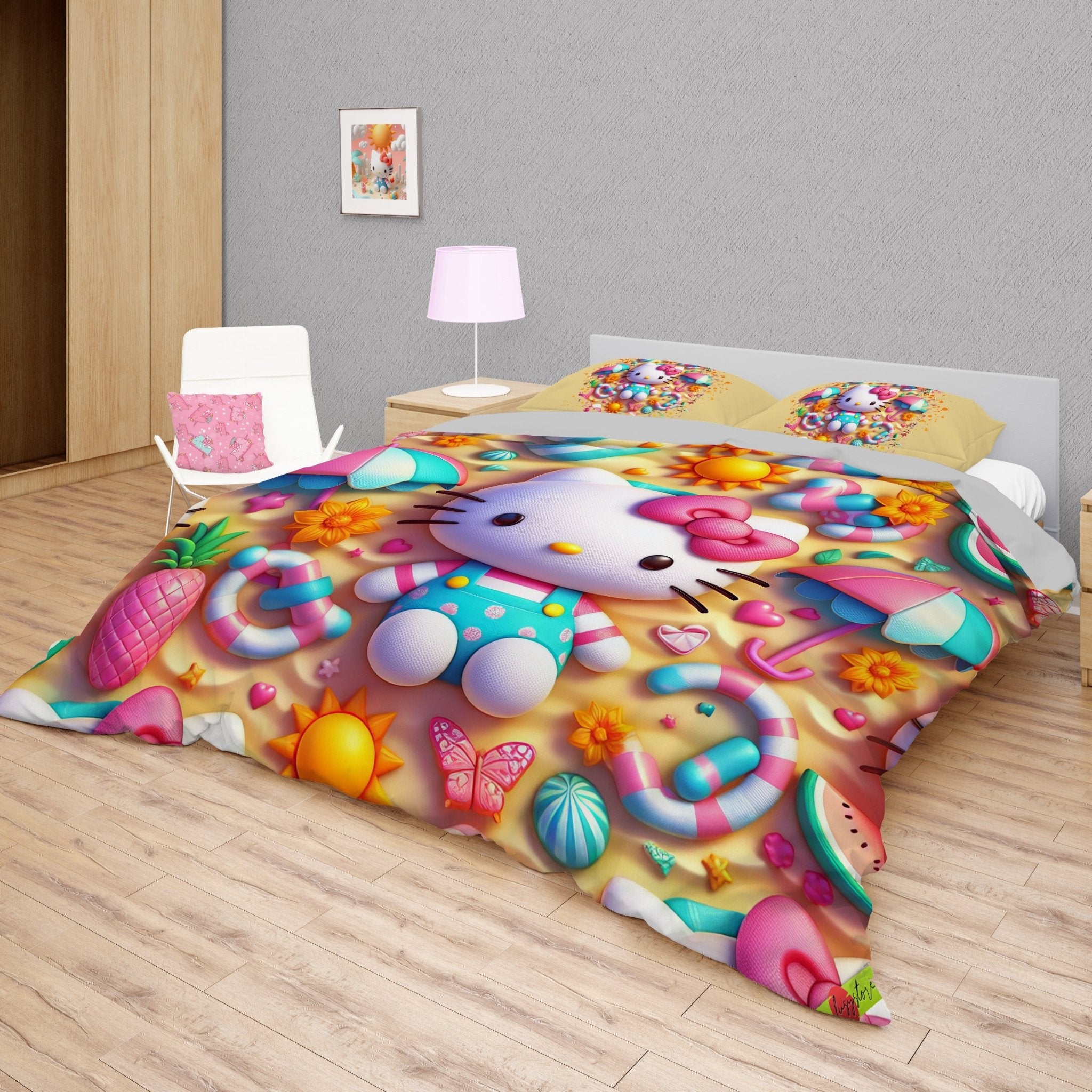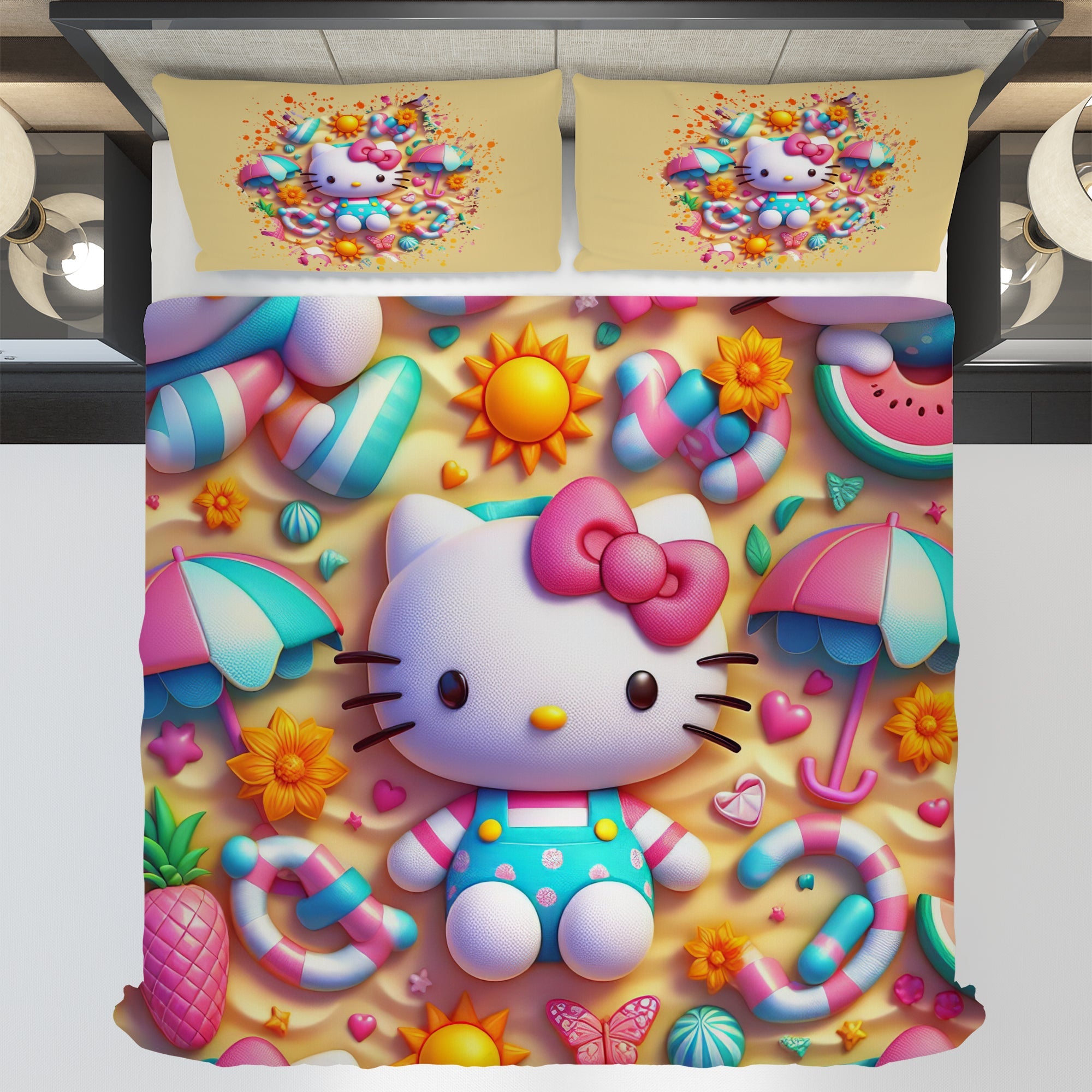 Elevate your bedroom decor with our Summer bedding sets featuring a 3D Hello Kitty design under the sand. Made from high-quality, soft material, these cute duvet cover and pillowcase sets are perfect for creating a cozy and stylish atmosphere. Add a touch of fun to your bedroom while enjoying a comfortable night's sleep.