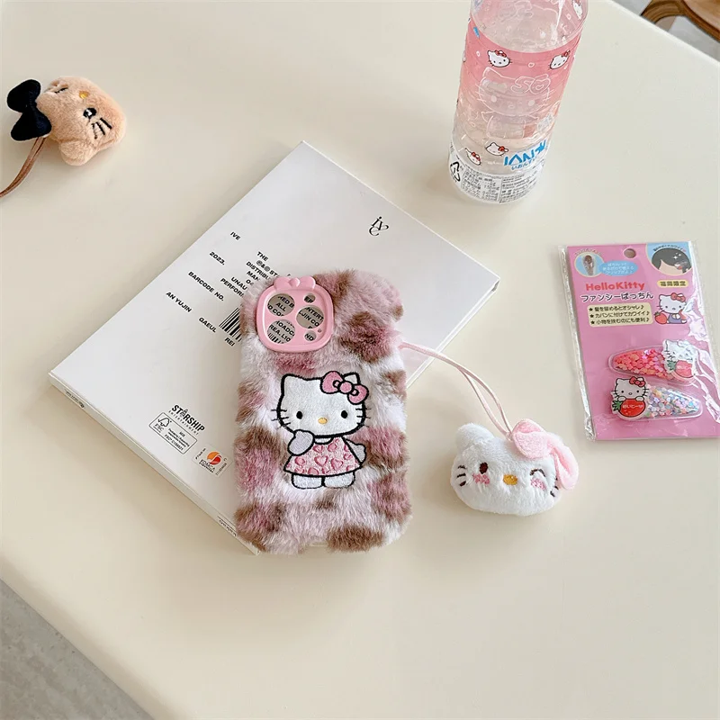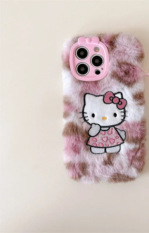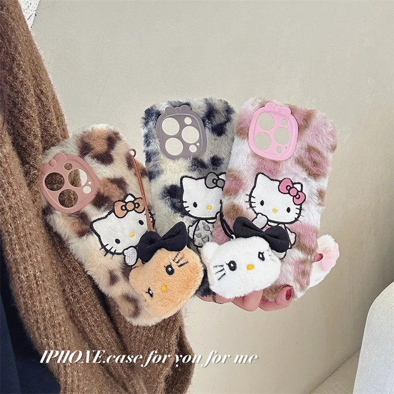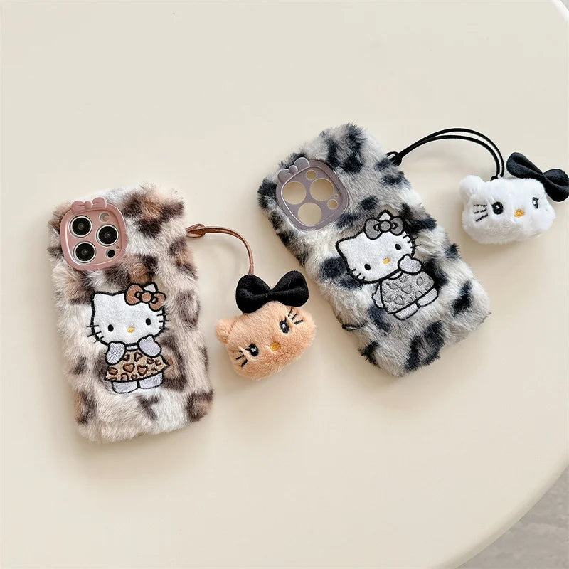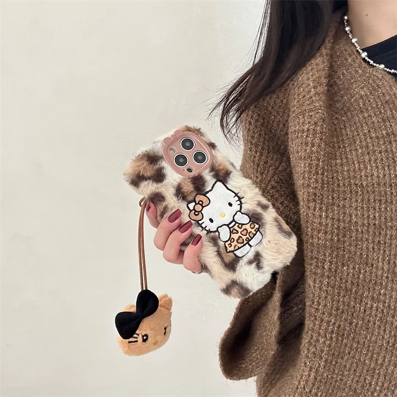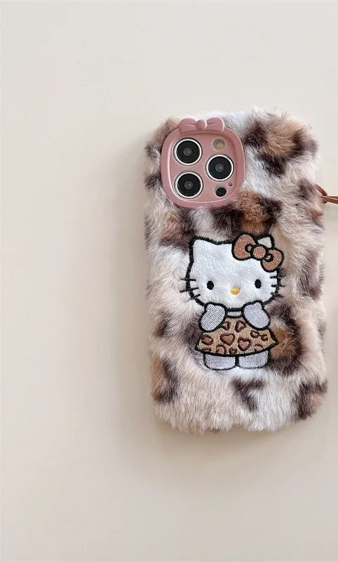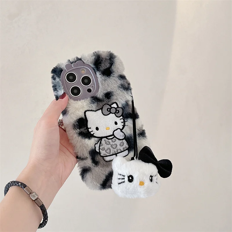 Elevate your iPhone style with the Luxury Winter Fluffy Hand Warmer Plush Leopard Hello Kitty Phone Case from Lusy Store. Designed for iPhone 16, 15, 14, and 13 Pro Max, this full-coverage case combines kawaii charm with practical features. Featuring a vibrant Hello Kitty cartoon design with a plush leopard print, it adds a touch of anime-inspired flair to your device. The case includes a furry wrist strap for easy carrying and a kickstand for hands-free viewing, making it both functional and fashionable.