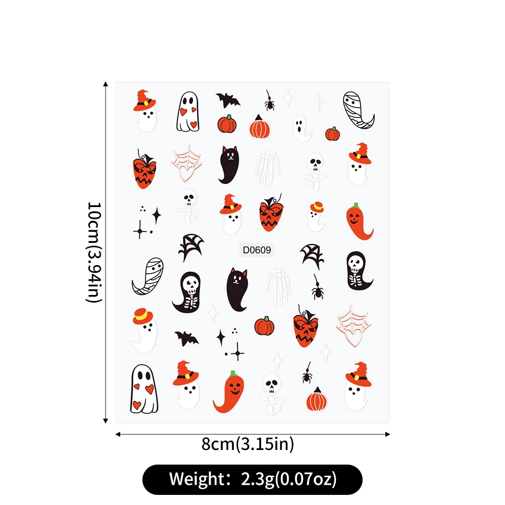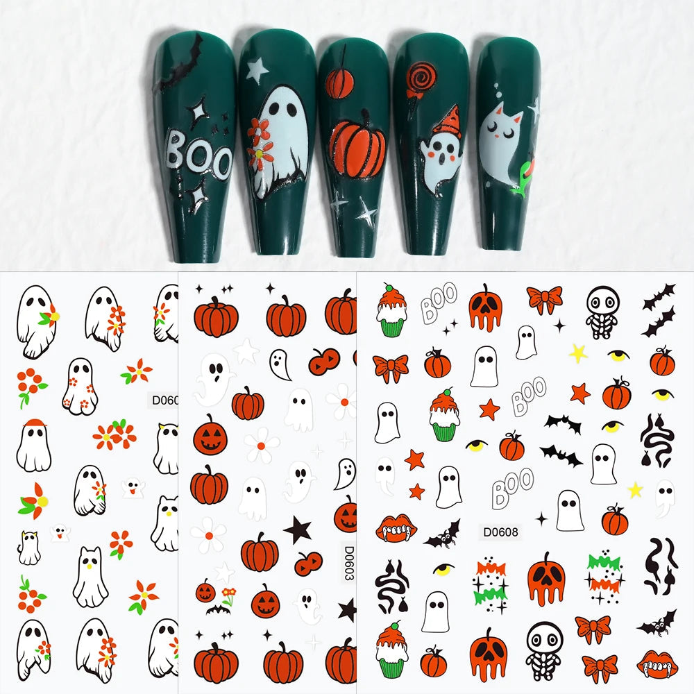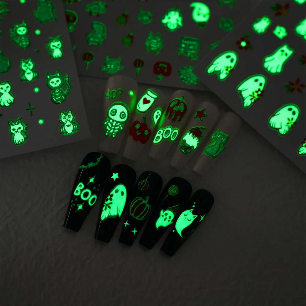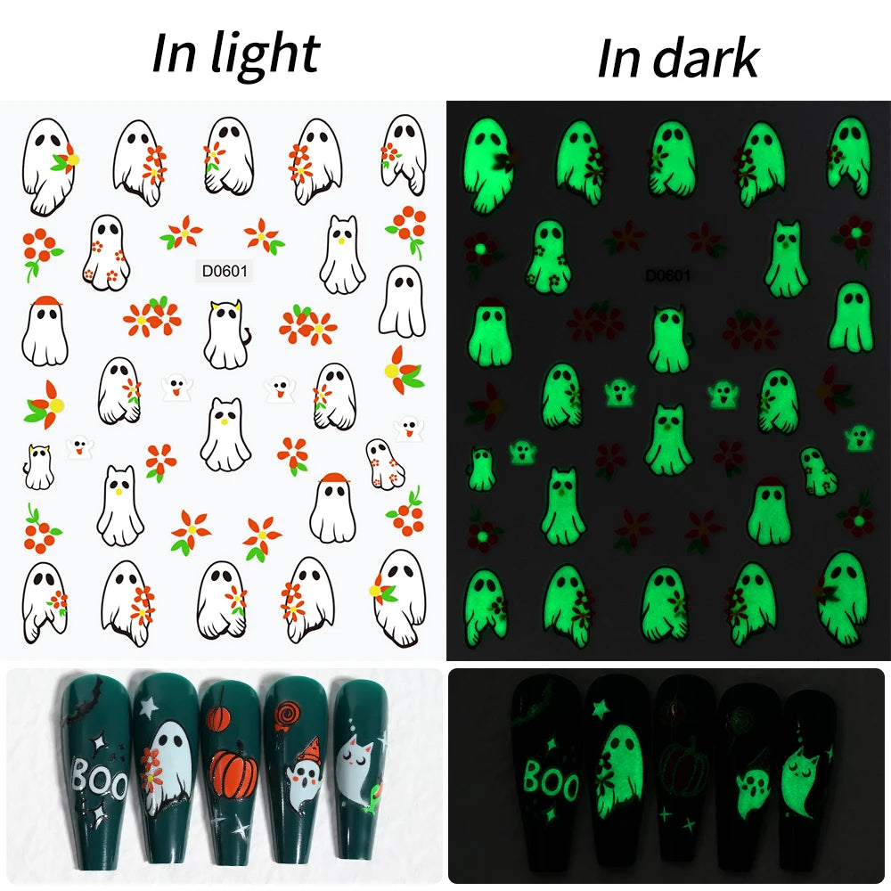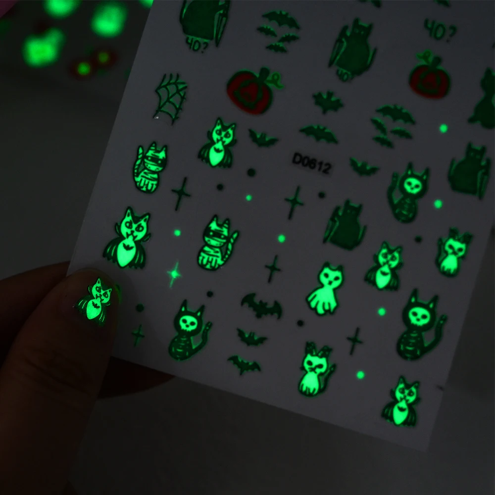 12Sheets Halloween Luminous Nail Art Stickers Cartoon Ghost /Pumpkin/Spider/Bat/Skull/Black-Cat Decals Manicure Adhesive Sliders