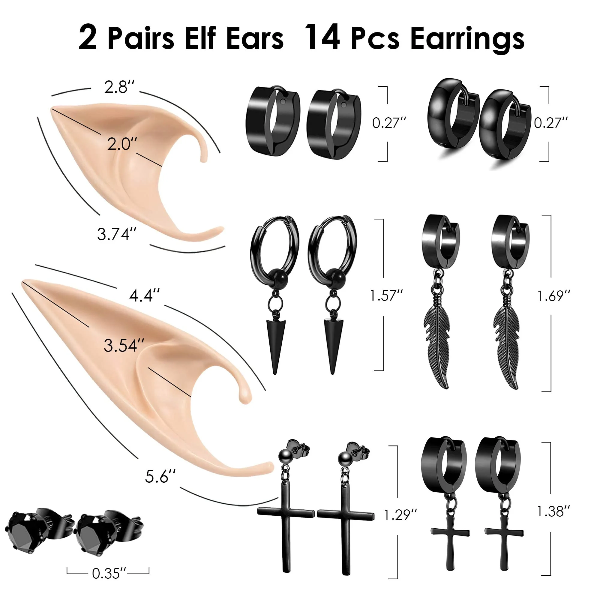 2-14pcs Stainless Steel Punk Dangle Hoop Piercing Earrings with 2Pairs Fairy Elf Ears for Women Men Halloween Cosplay Photo Prop