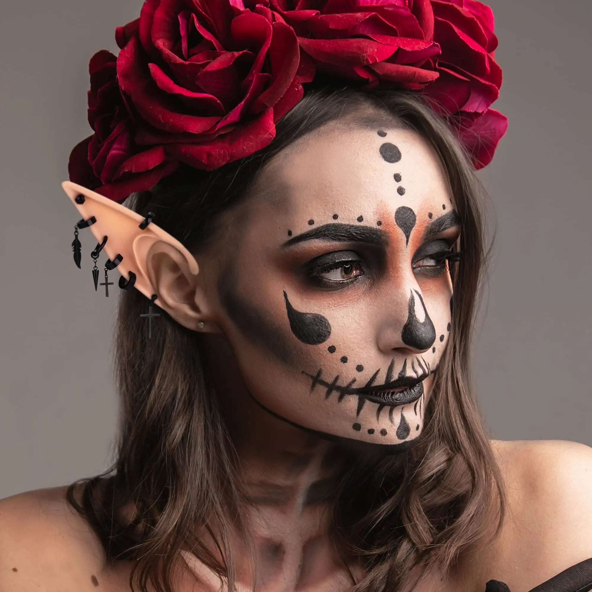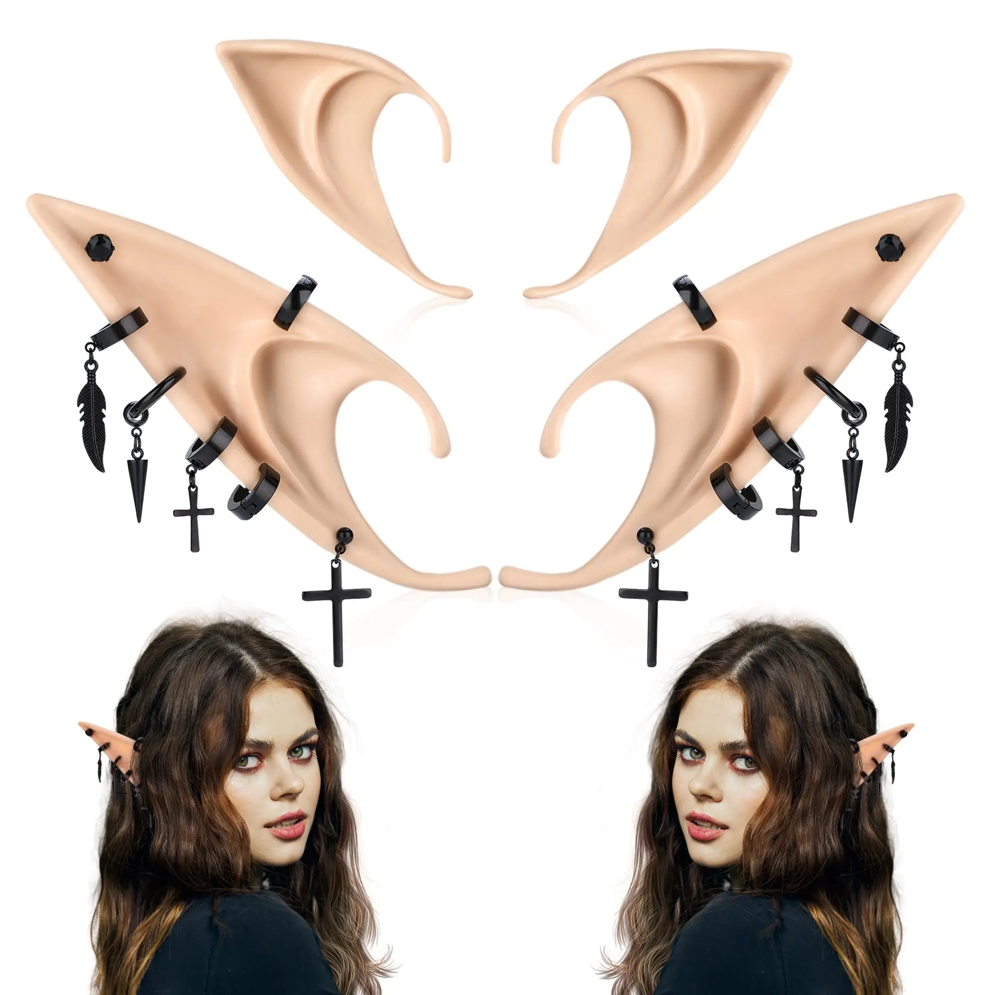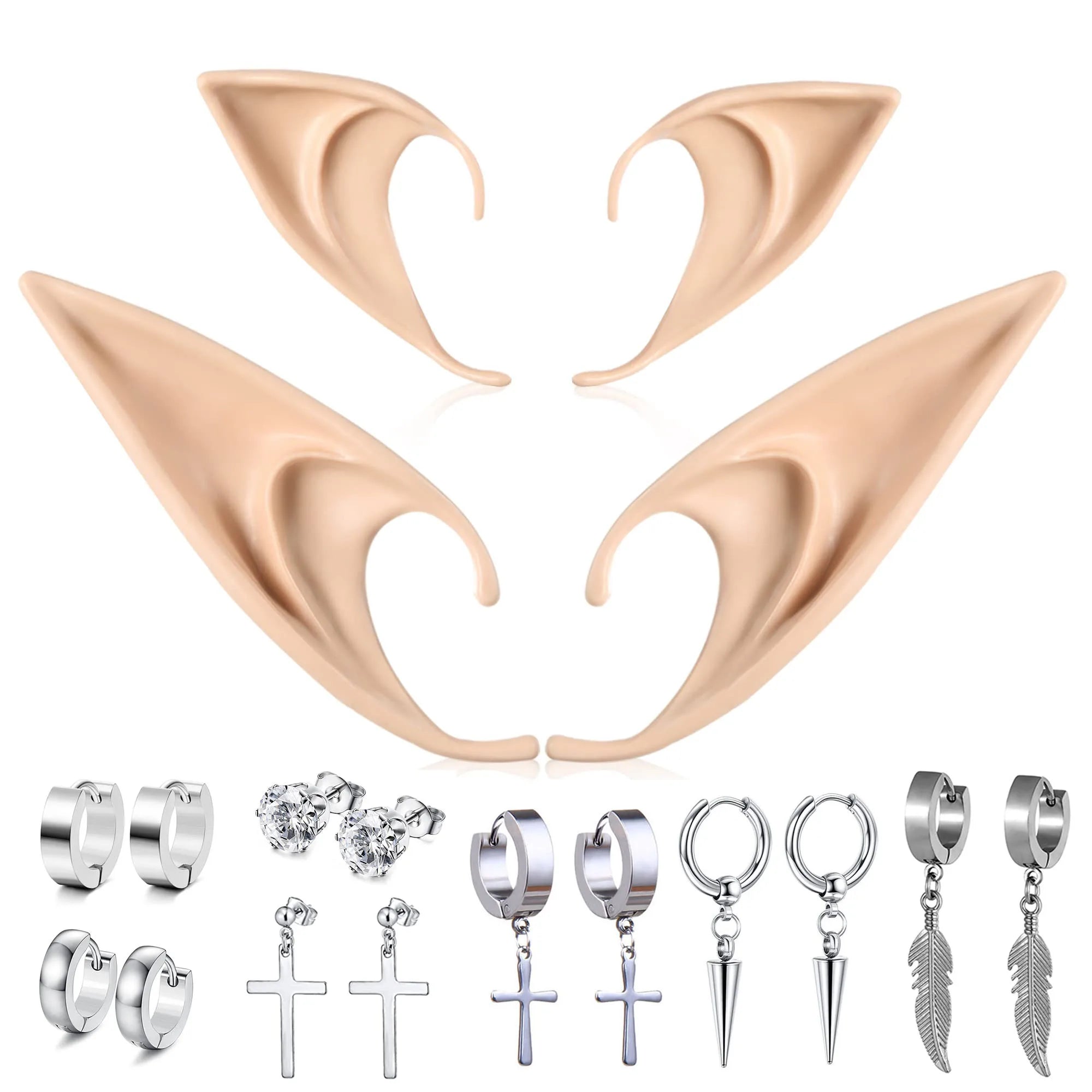 2-14pcs Stainless Steel Punk Dangle Hoop Piercing Earrings with 2Pairs Fairy Elf Ears for Women Men Halloween Cosplay Photo Prop SALE