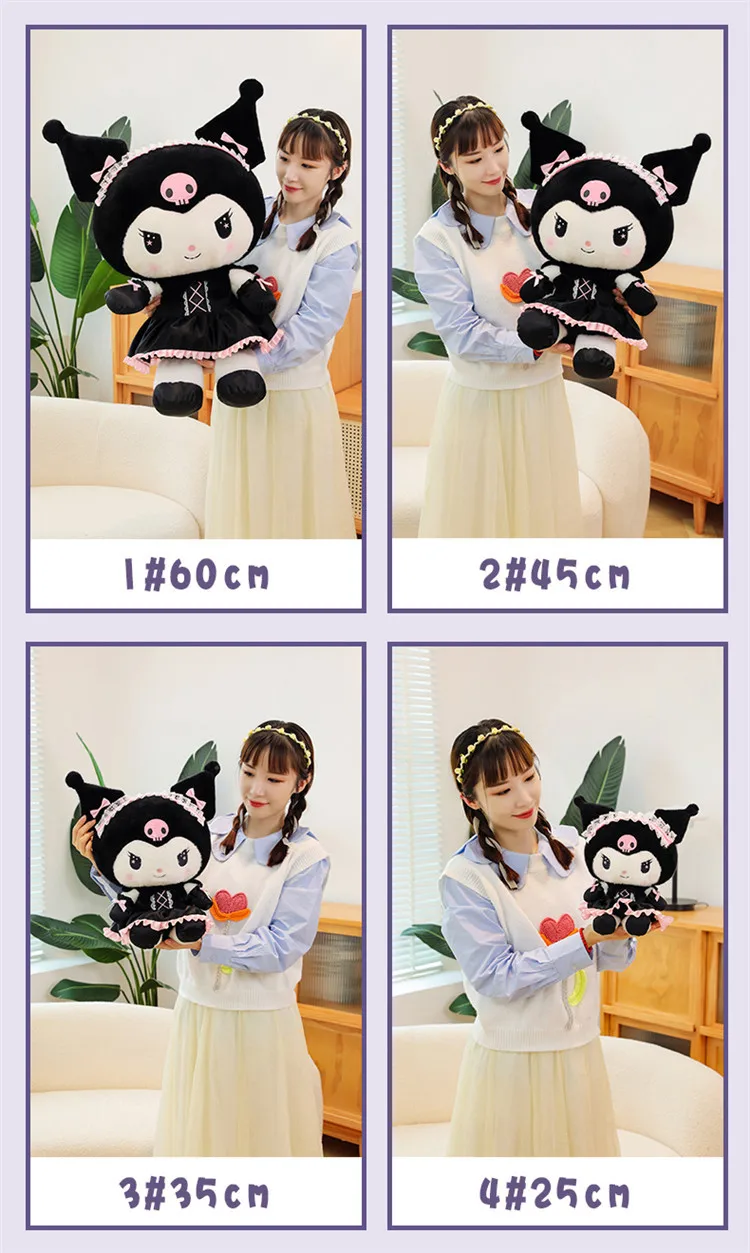 This 25cm Kuromi plush toy features the beloved Sanrio character dressed in a cute outfit, perfect as a soft pillow or cuddly companion. Made from plush materials, it offers a cozy, comforting feel ideal for children and collectors alike. Its charming design and size make it a wonderful gift for girls, especially during the holidays, bringing a touch of kawaii charm to any room.