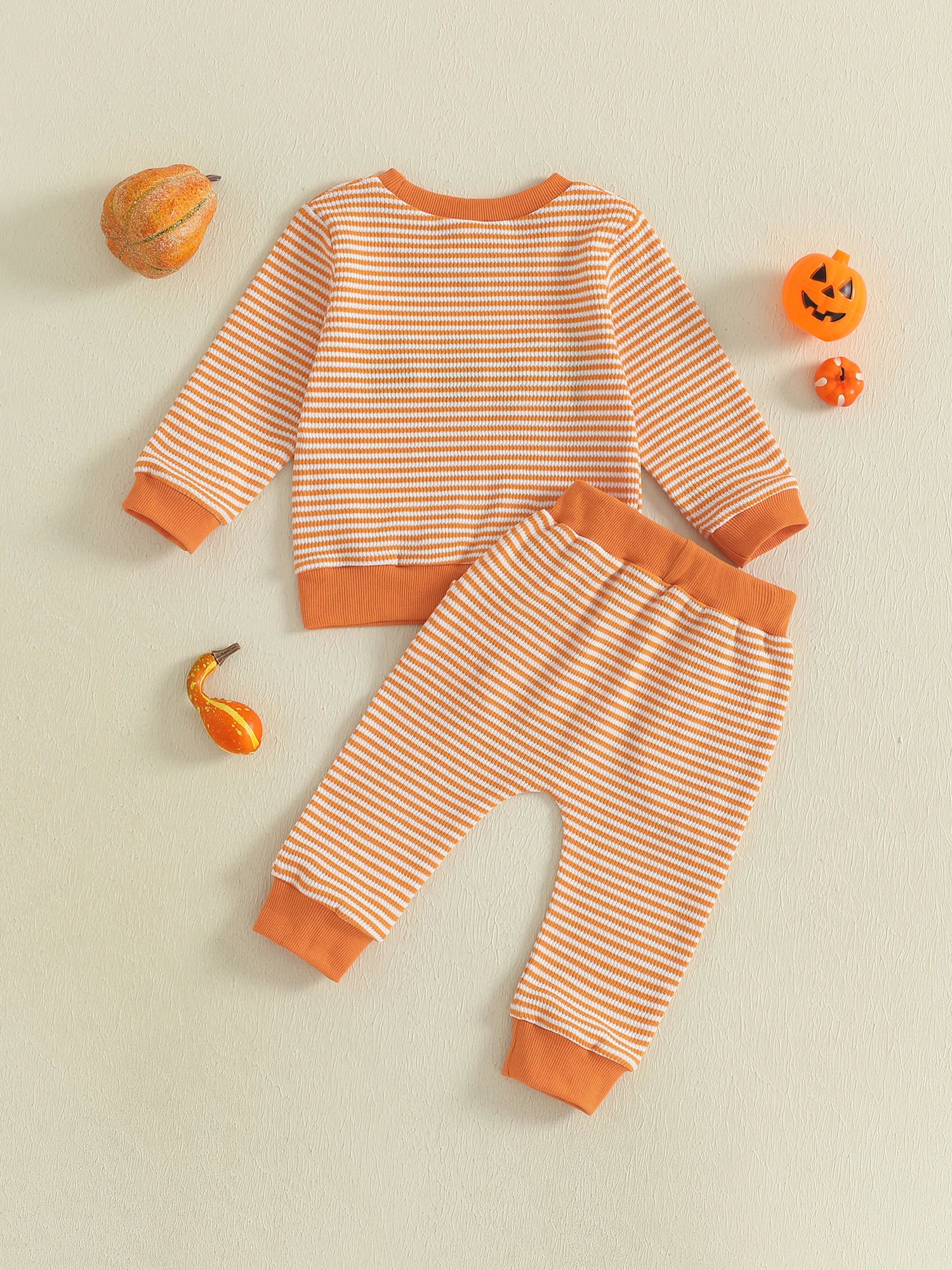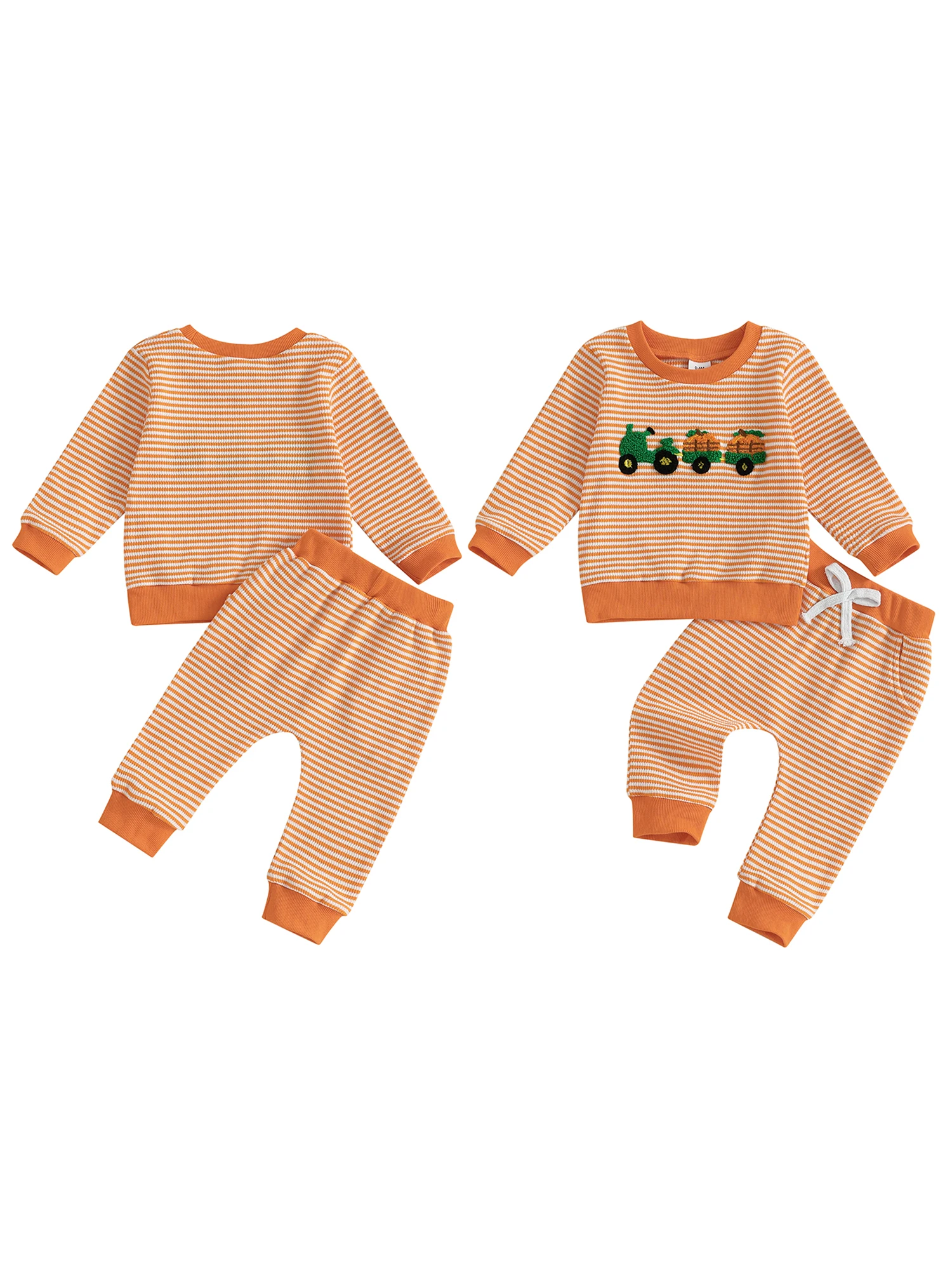 Toddler Baby Boy Halloween Outfit Tractor Pumpkin Embroidery Striped Crew Neck Long Sleeve Sweatshirt with Pants 2 Pcs Set