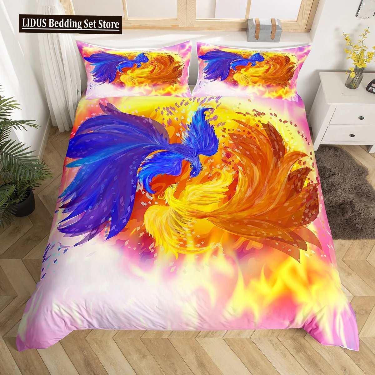 Dragon And Phoenix Duvet Cover Set Full Queen Size, Fantasy World Monster Gothic Bedding Sets Bohemian Mandala Comforter Cover