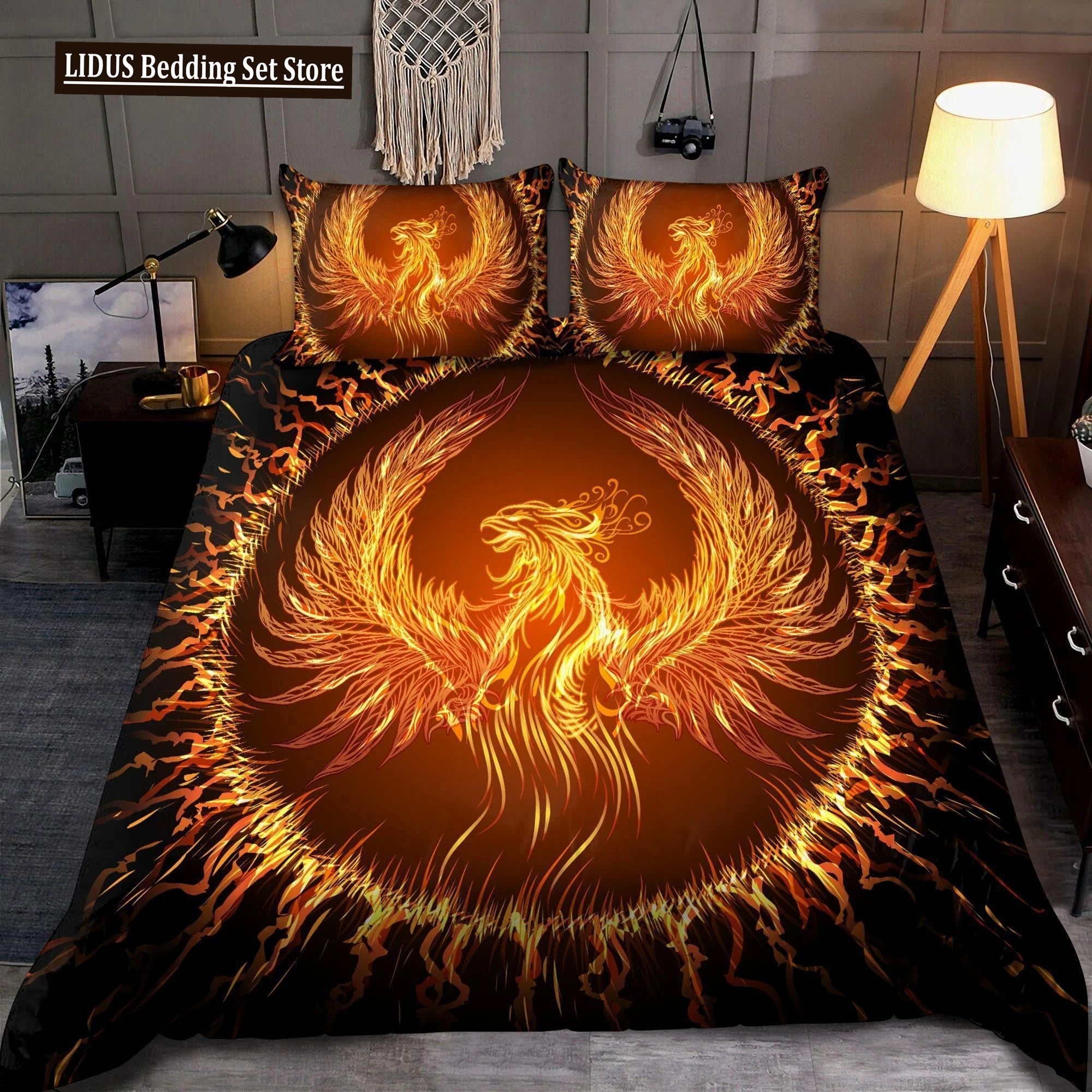Experience a unique blend of fantasy and elegance with the Dragon and Phoenix Duvet Cover Set, designed for full to queen-size beds. This bedding set features intricate gothic and bohemian mandala patterns, bringing a mystical and artistic touch to your bedroom. Crafted to provide comfort with a bold, imaginative design, it’s perfect for those who want to create a captivating and cozy sleep environment inspired by mythical creatures. Durable and stylish, this comforter cover set supports restful nights with a fantastical flair.