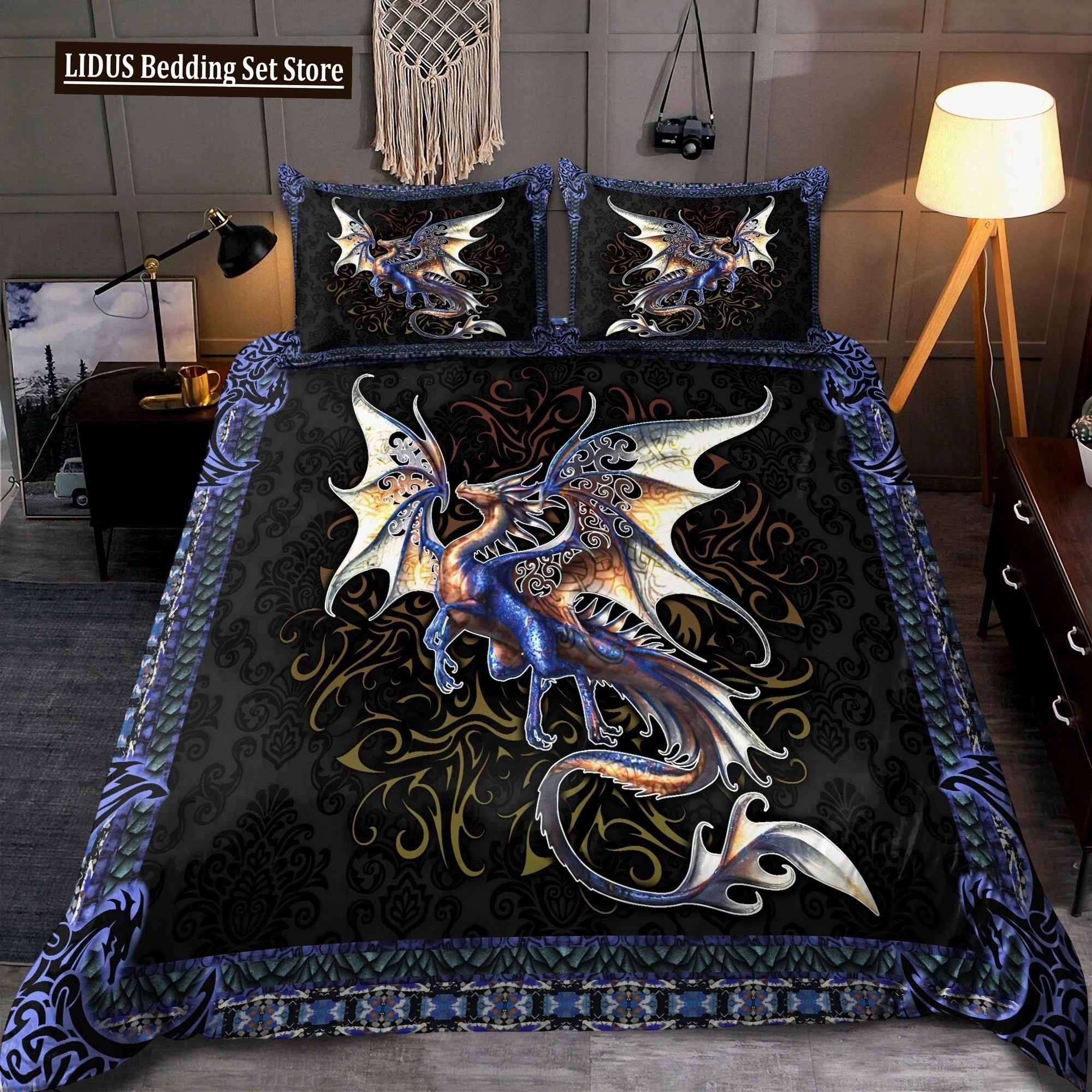 Dragon And Phoenix Duvet Cover Set Full Queen Size, Fantasy World Monster Gothic Bedding Sets Bohemian Mandala Comforter Cover