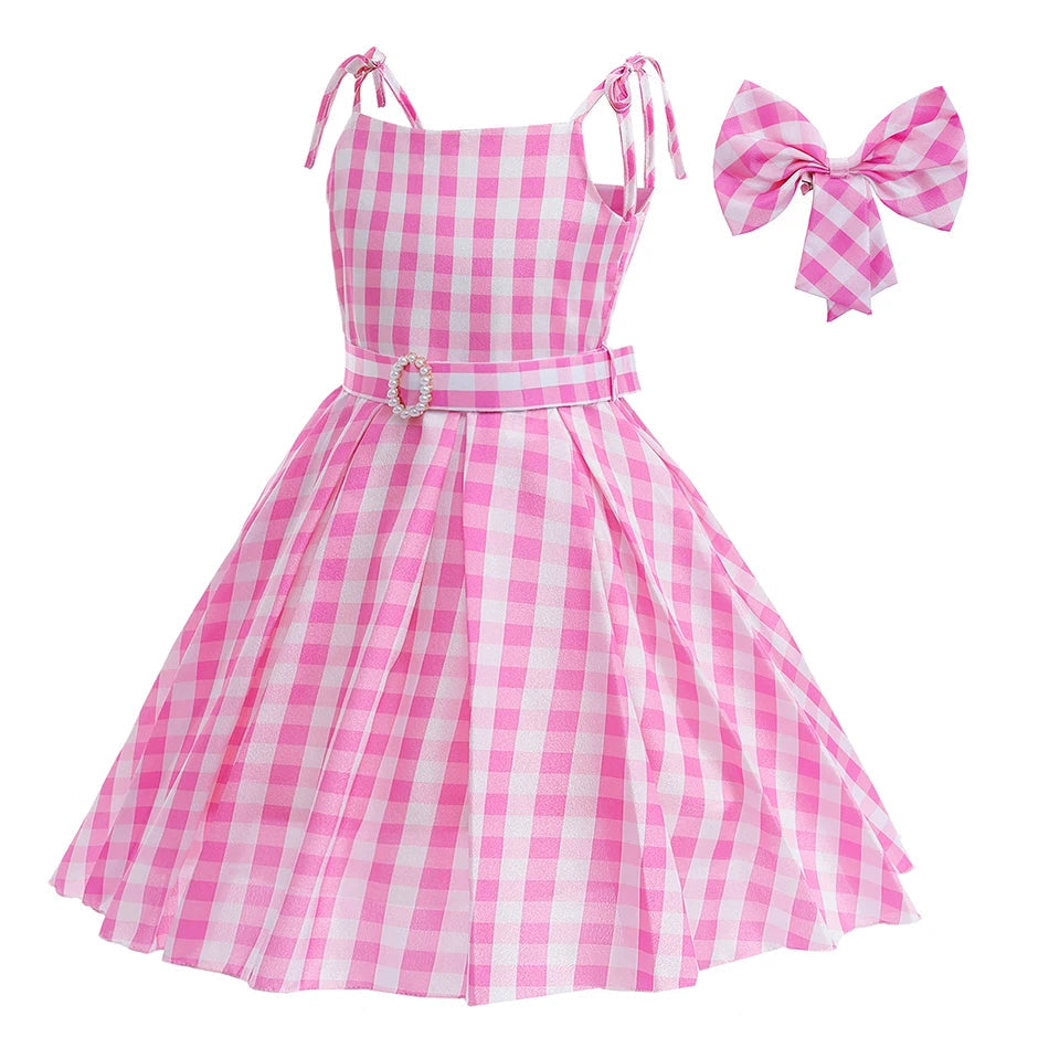 Girls Pink Barbie Princess Dress Movie Role Playing Costume With Belt Plaid Sling Dress Halloween Birthday Outfit Dress Up 2-10T SALE