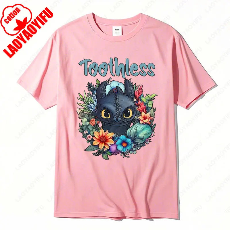 How To Train Your Dragon Toothless Floral Cotton T-Shirt Fashion Cartoon Anime Graphic Tshirt Funny Kawaii Men Woman Casual Tee Wu-pink-04 SALE