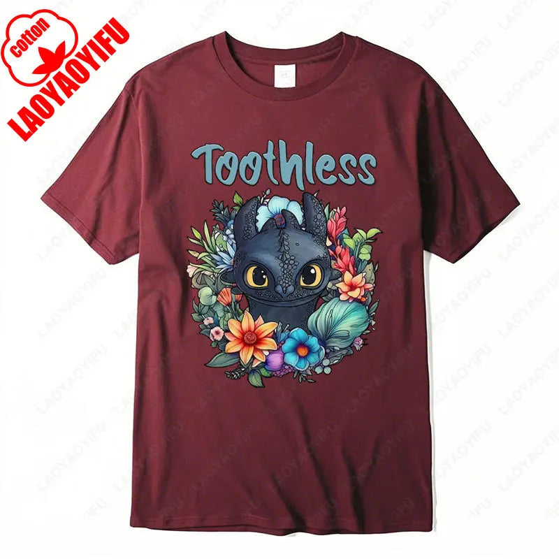 How To Train Your Dragon Toothless Floral Cotton T-Shirt Fashion Cartoon Anime Graphic Tshirt Funny Kawaii Men Woman Casual Tee Wu-wine red-07 SALE