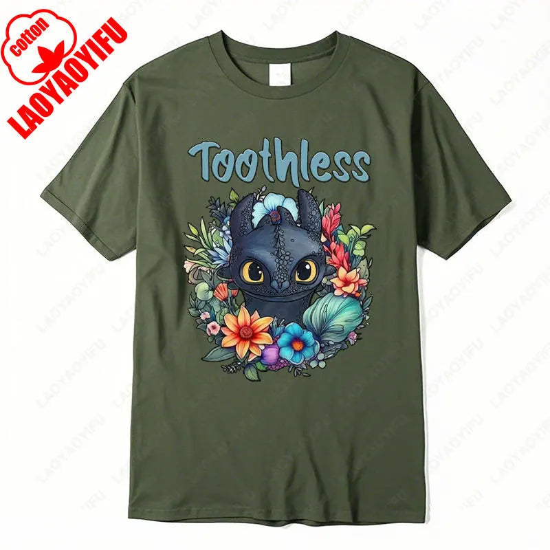 How To Train Your Dragon Toothless Floral Cotton T-Shirt Fashion Cartoon Anime Graphic Tshirt Funny Kawaii Men Woman Casual Tee Wu-army green-08 SALE