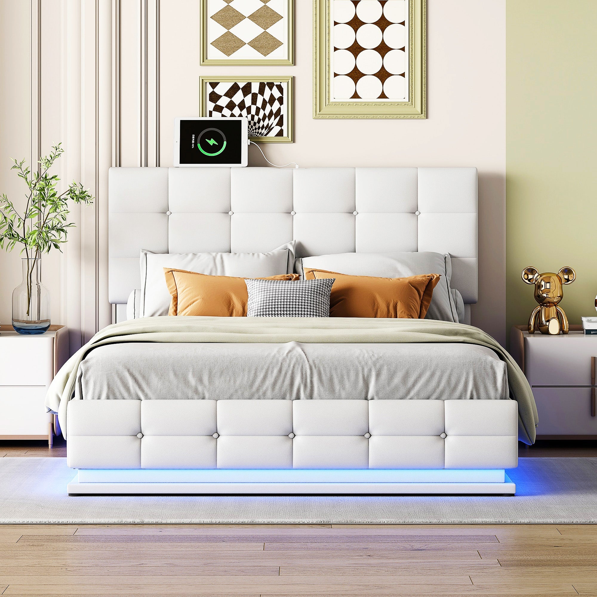 This tufted PU upholestered bed with LED lights is easy to make your home unique.The LED lights have so many color options, bringing you a romantic night and a comfortable sleep.A hydraulic storage system underneath the mattress makes storing your bedroom things in smaller spaces possible.There is a USB charger in the middle of the headboard, you can easily charge your mobile phone or ipad.Sturdy wood frame construction and a wooden slat system to add extra stability and safety.