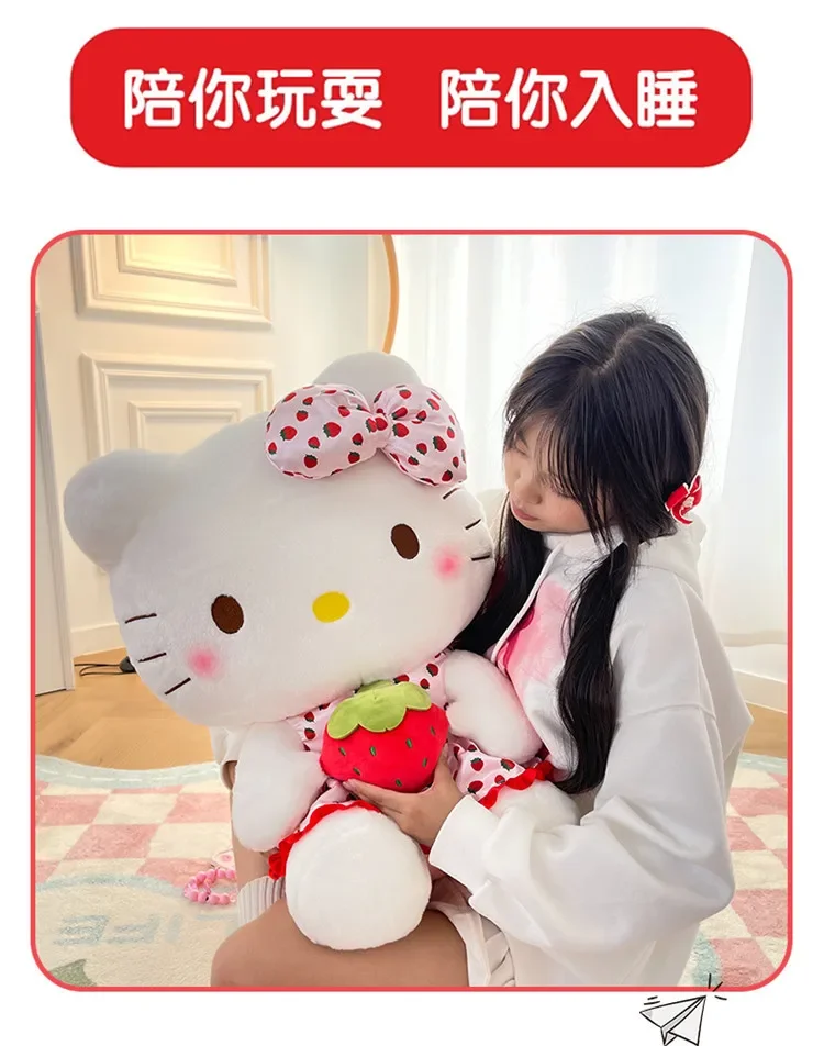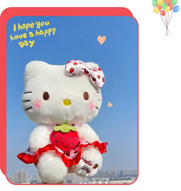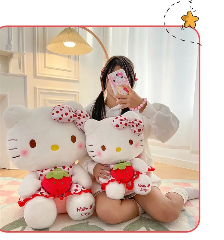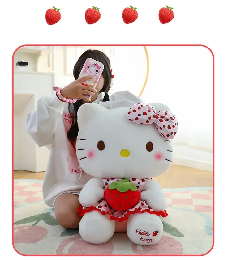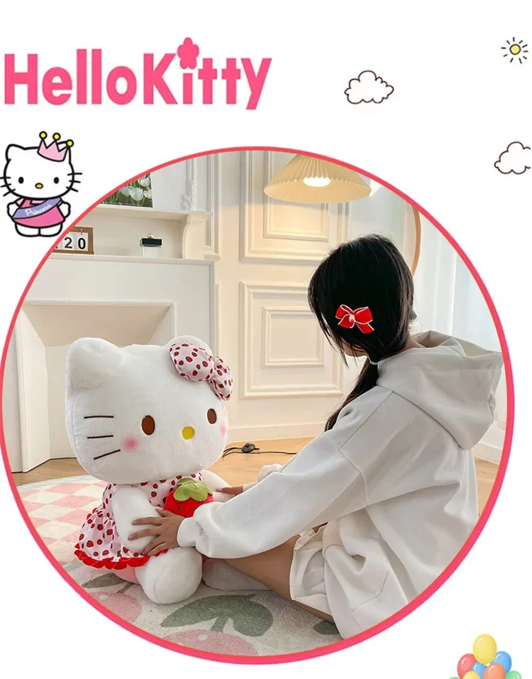 Bring a sweet touch of Kawaii to your home with this delightful Sanrio Hello Kitty Plush Doll! Dressed as a charming strawberry cat, this soft and cuddly plush is perfect for decorating your room, serving as a comfortable pillow, or simply hugging. It makes an excellent and memorable gift for any fan of cute characters and is a wonderful choice for birthdays.