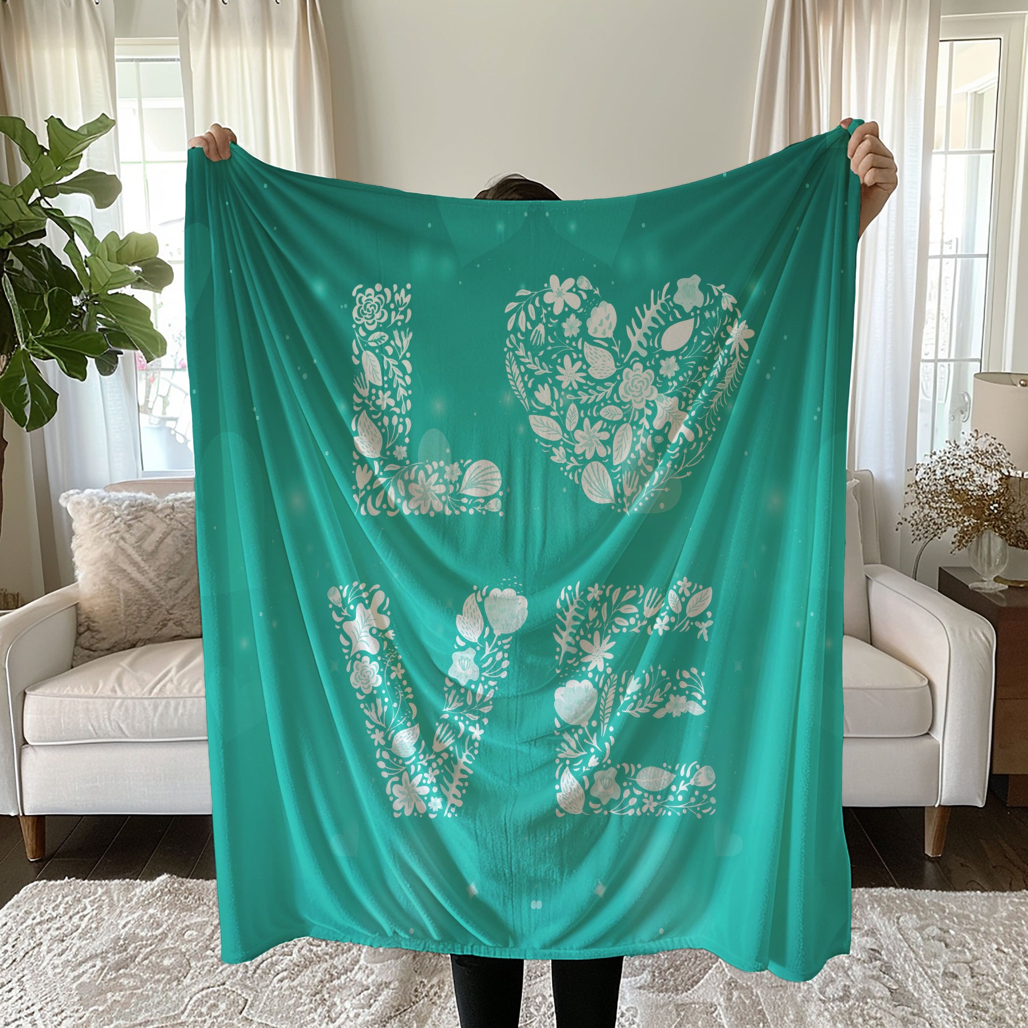 The Valentine's Day bedding set features a modern, romantic aesthetic centered on the word "LOVE." Each letter is adorned with hand-drawn floral motifs and delicate hearts, set against a rich teal background. The symmetrical design and faint sparkle effects create a cozy, harmonious vibe, making your bedroom a perfect retreat for the season of love.