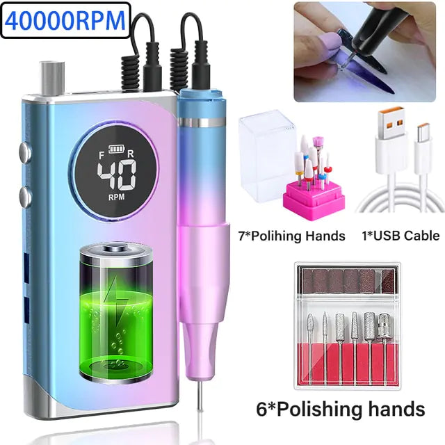 Take control of your nail care routine with our rechargeable nail drill machine. The powerful 40000RPM motor, combined with the easy-to-read LCD display, ensures you have all the power and precision you need for stunning nails, whether you're at home or in a salon.