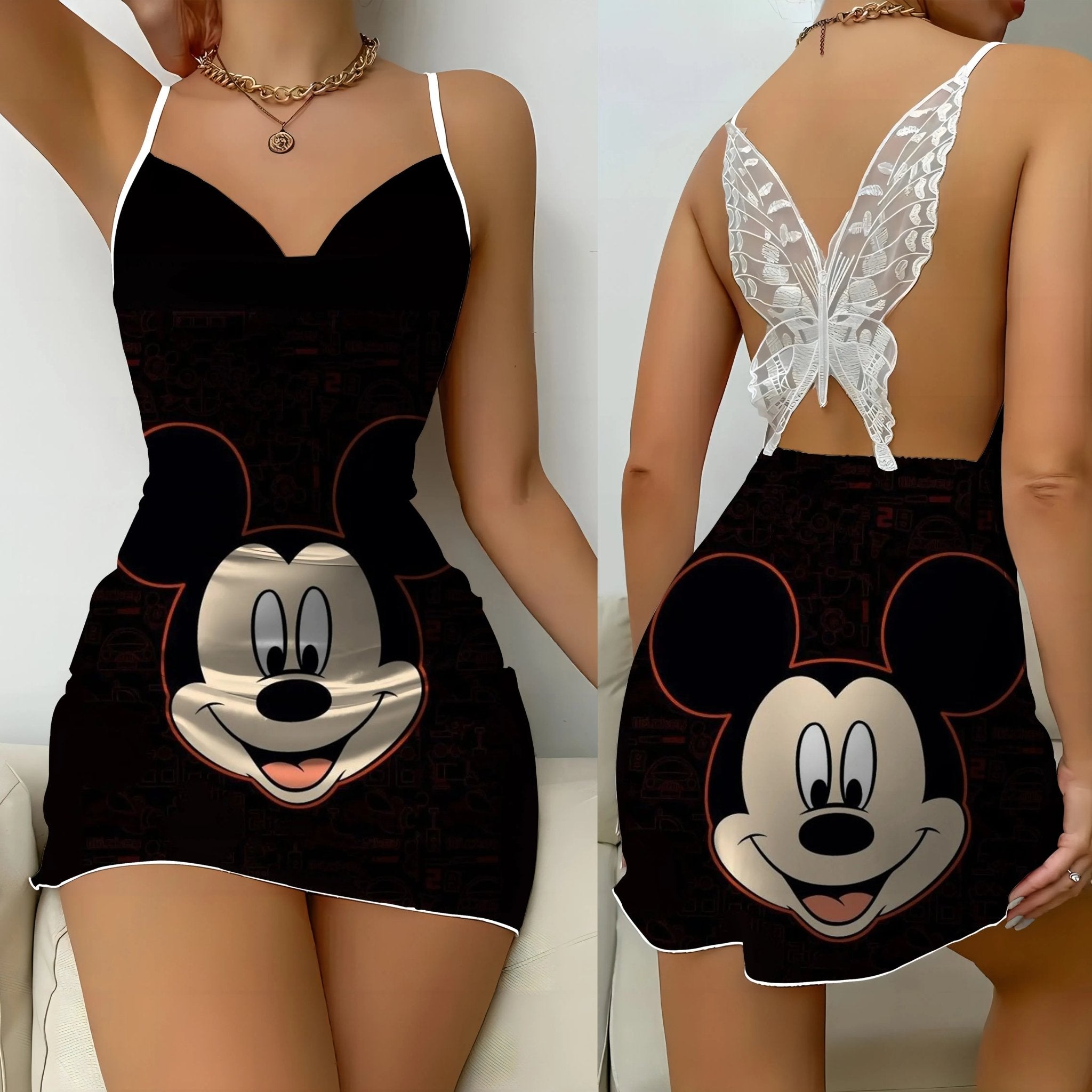 Add a touch of playful charm to your bedtime routine with this backless dress featuring Mickey and Minnie Mouse. The bow knot detail and satin surface add a touch of elegance while keeping you comfortable. Perfect for any fashion-forward woman who wants to feel fun and stylish while they sleep.