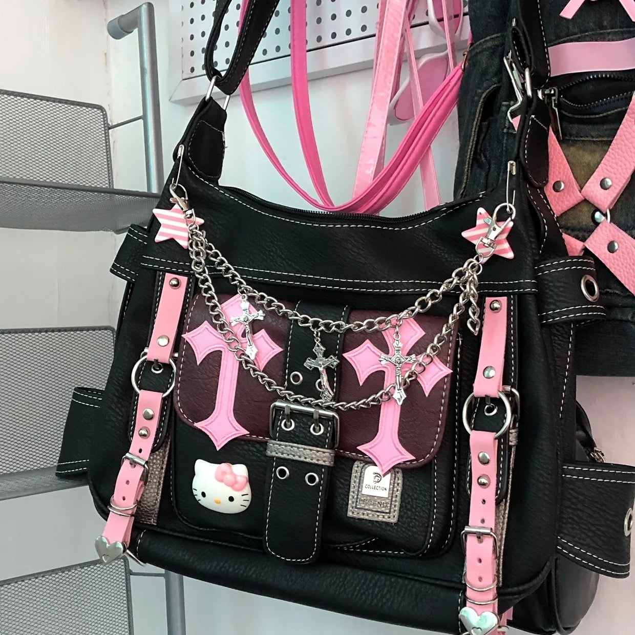 Hello Kitty Gothic Punk Vintage Pink Cross Chains Crossbody Bags For Women