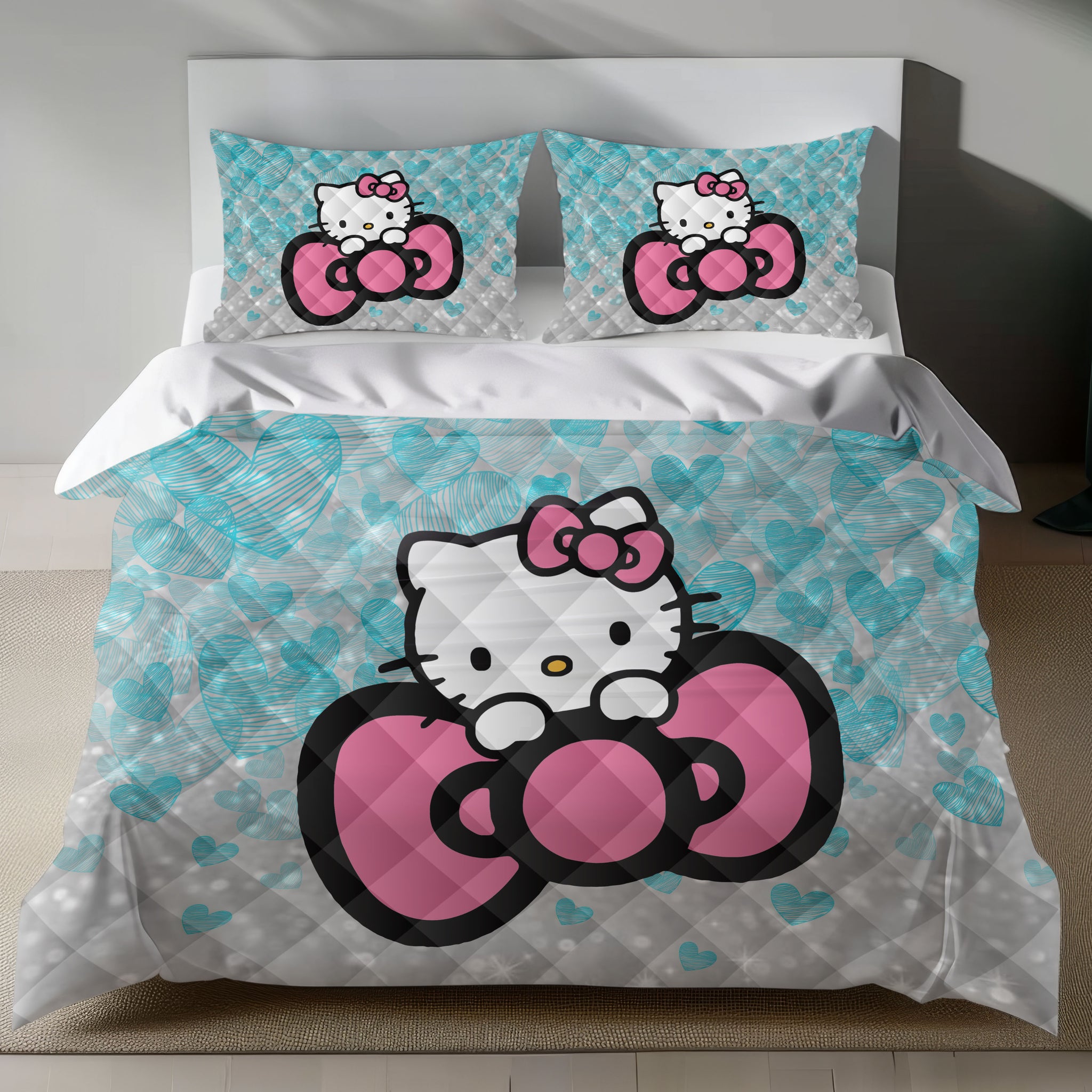 The duvet cover showcases a large, central Hello Kitty graphic, complete with a bold pink bow and a playful teal backdrop. Light blue, hand-drawn hearts and shimmering white sparkles add a magical touch, creating a fun and inviting atmosphere. The matching pillowcases echo this design, ensuring a cohesive and charming look for your bedroom.