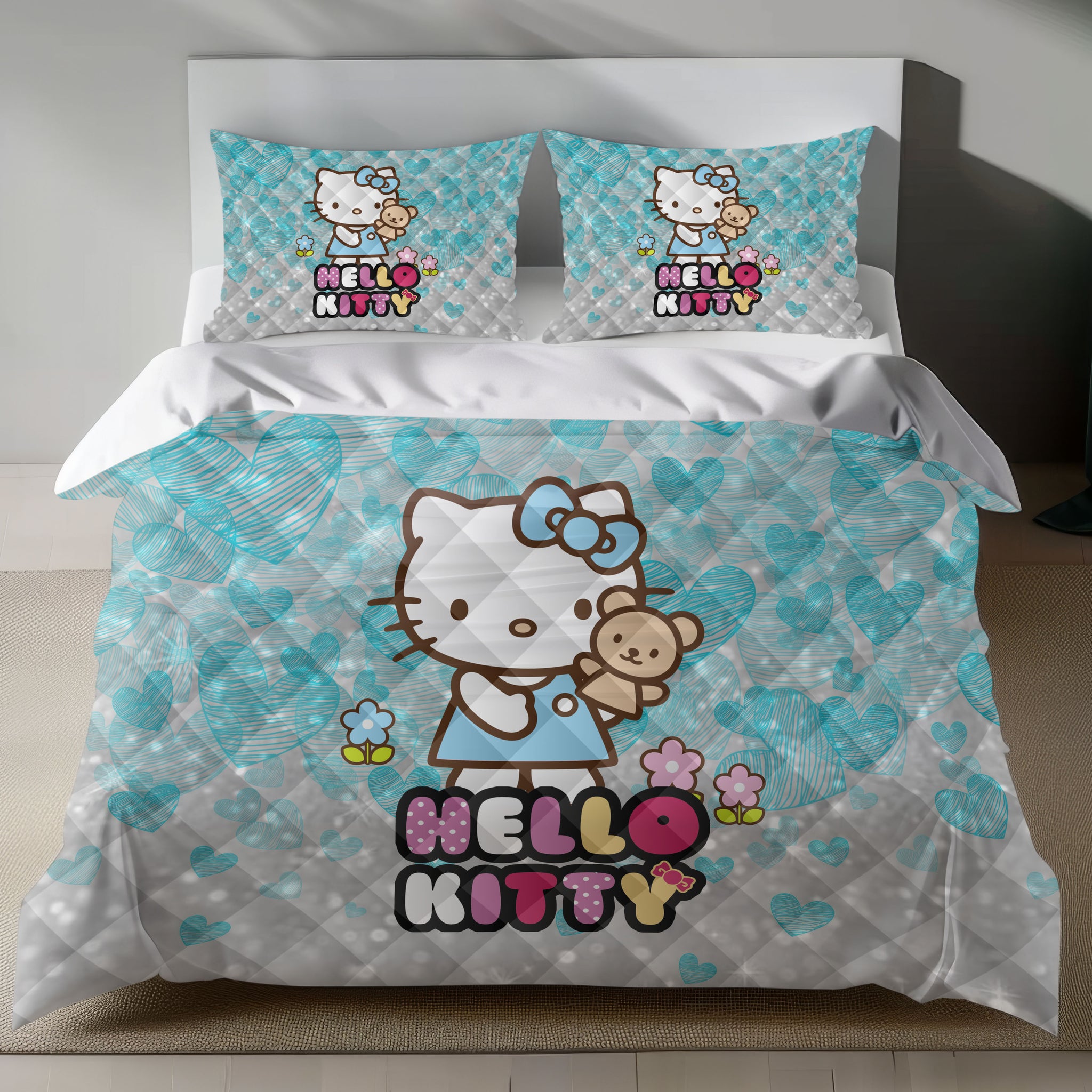 The duvet cover showcases a large, vibrant image of Hello Kitty in a blue dress, cuddling a brown teddy bear, set against a soft teal background adorned with light blue hearts and sparkling white dots. The playful 'HELLO KITTY' text in multicolored letters adds a fun touch to the design. The matching pillowcases complete the look, ensuring your bed is both stylish and comfortable.