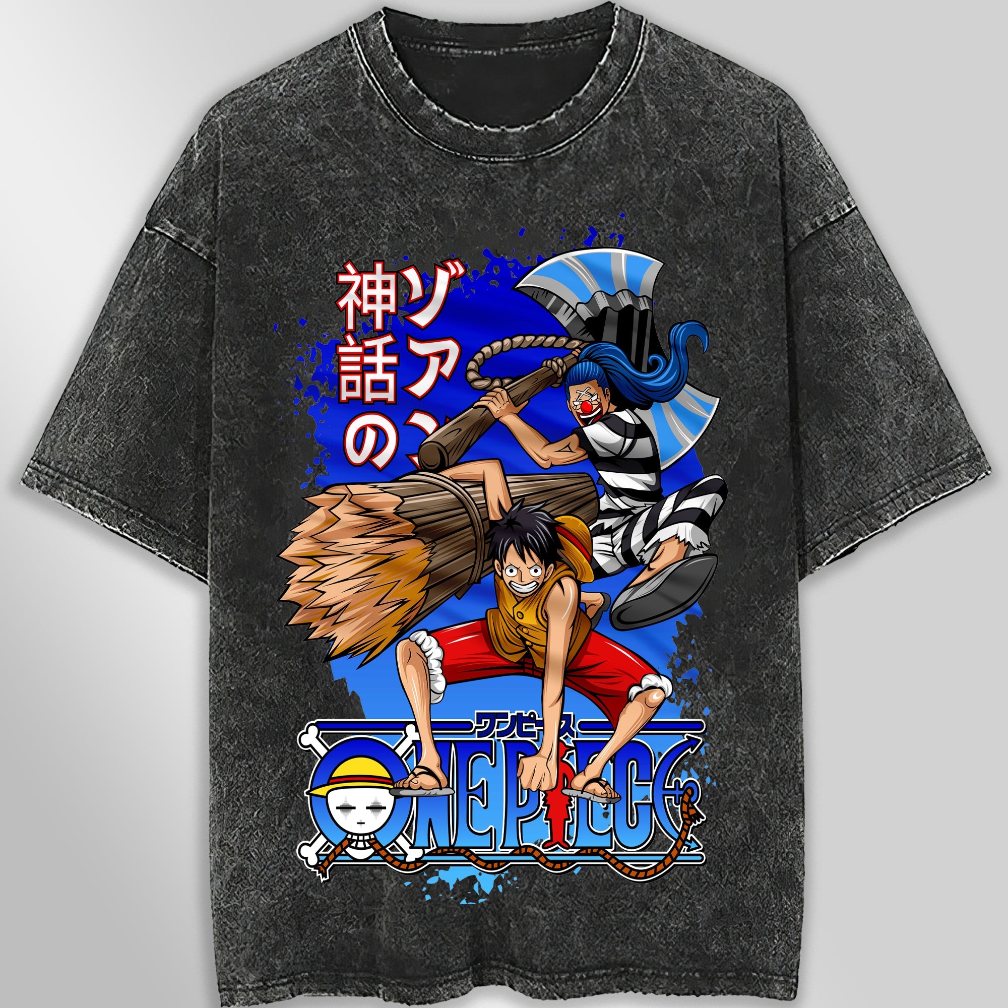 The One Piece Tee Shirt features a unique Luffy Buggy graphic design on a vintage gray t-shirt. Perfect for streetwear enthusiasts, this unisex tee offers a stylish and versatile addition to any wardrobe. Made with high-quality materials, this tee provides both comfort and durability. Get yours today and stand out from the crowd!