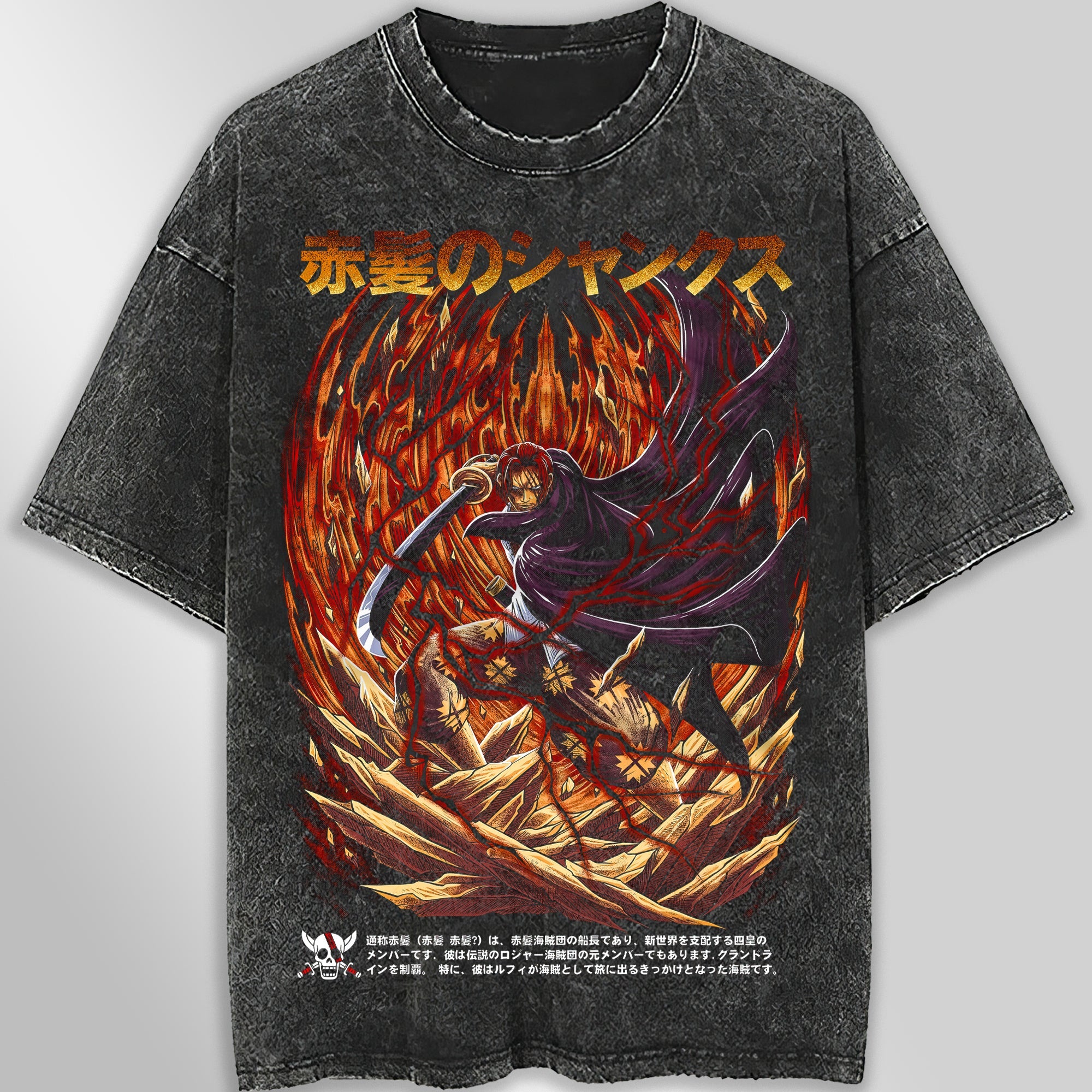 This One Piece t-shirt features a vintage Shanks graphic, perfect for fans of the popular manga series. Made with comfortable gray fabric, this streetwear-inspired unisex tee is a must-have addition to your wardrobe. Show off your love for One Piece in style.