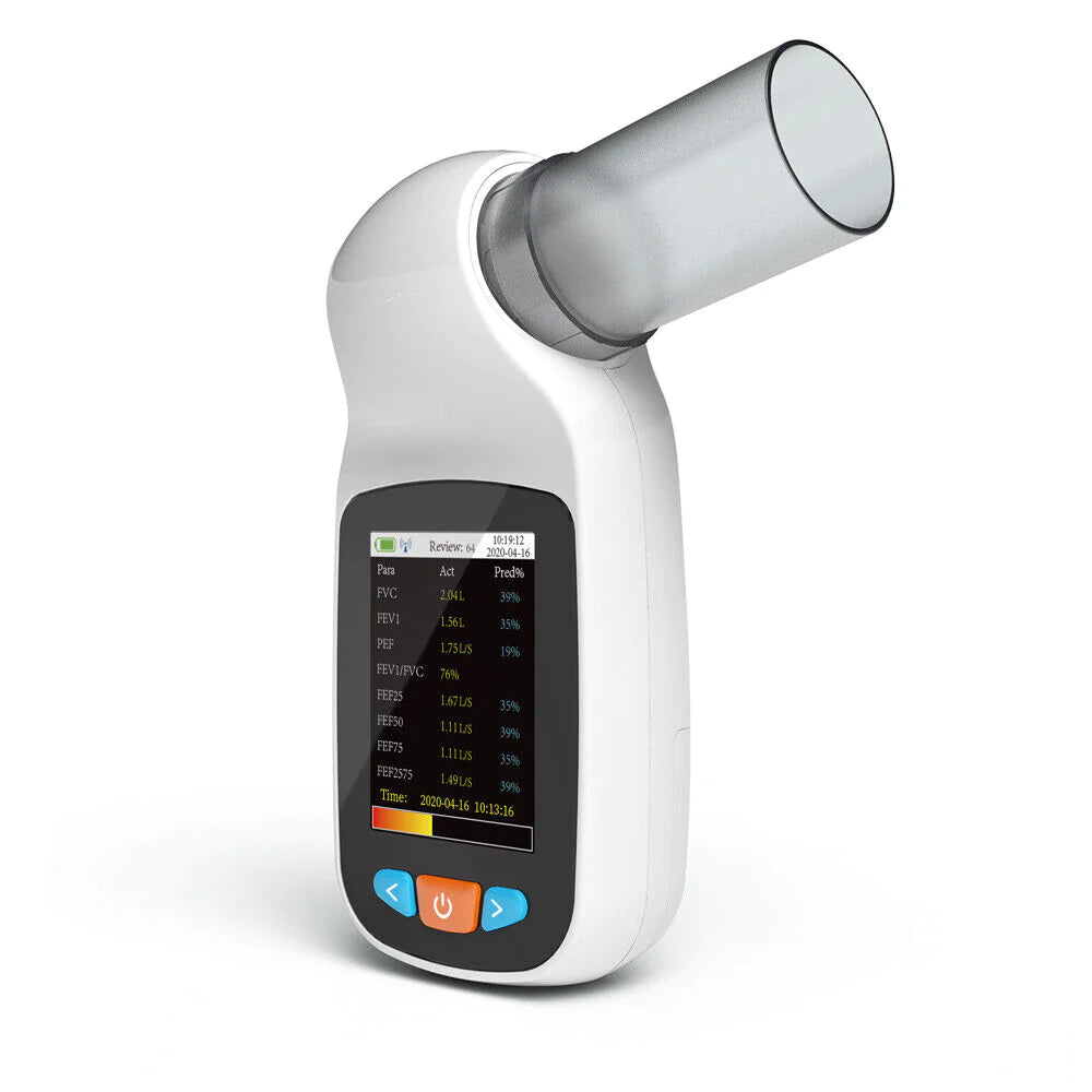The SPIROMETER is a compact, hand-held device designed for assessing lung function. It utilizes infrared technology to measure various respiratory parameters, making it suitable for use in hospitals, clinics, or home settings for routine health checks.