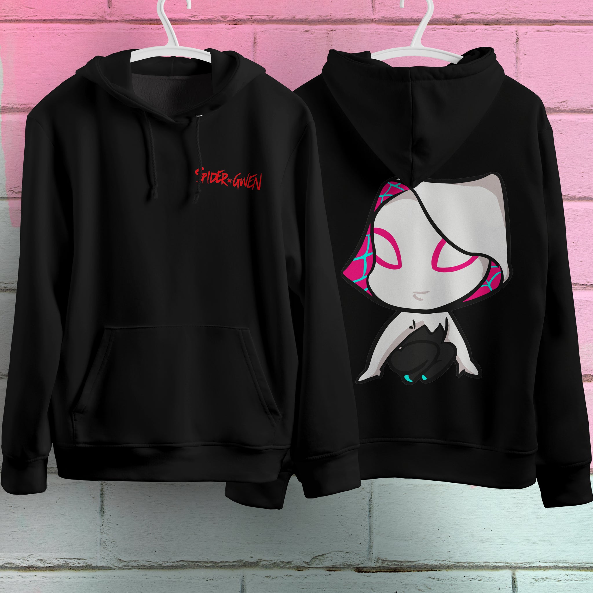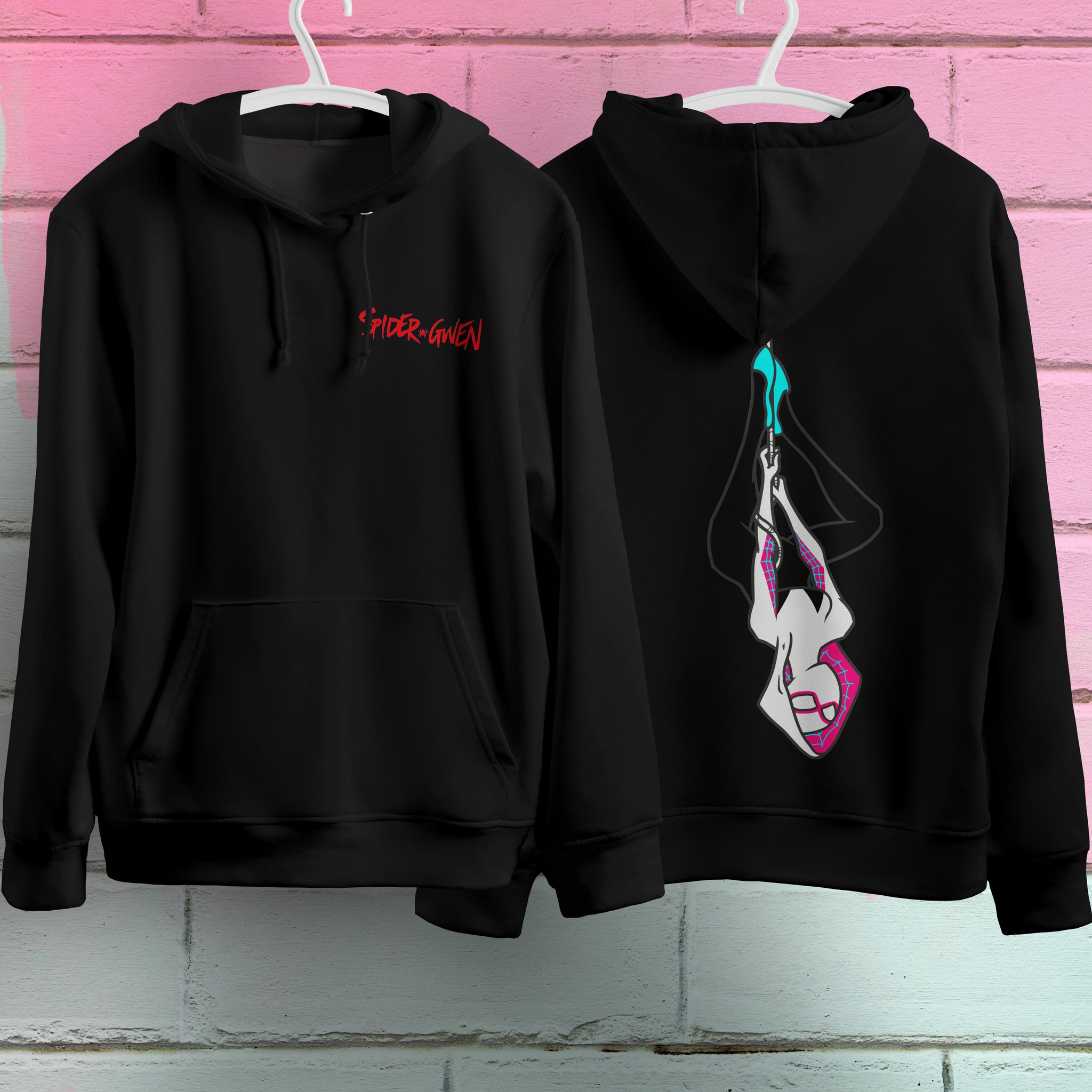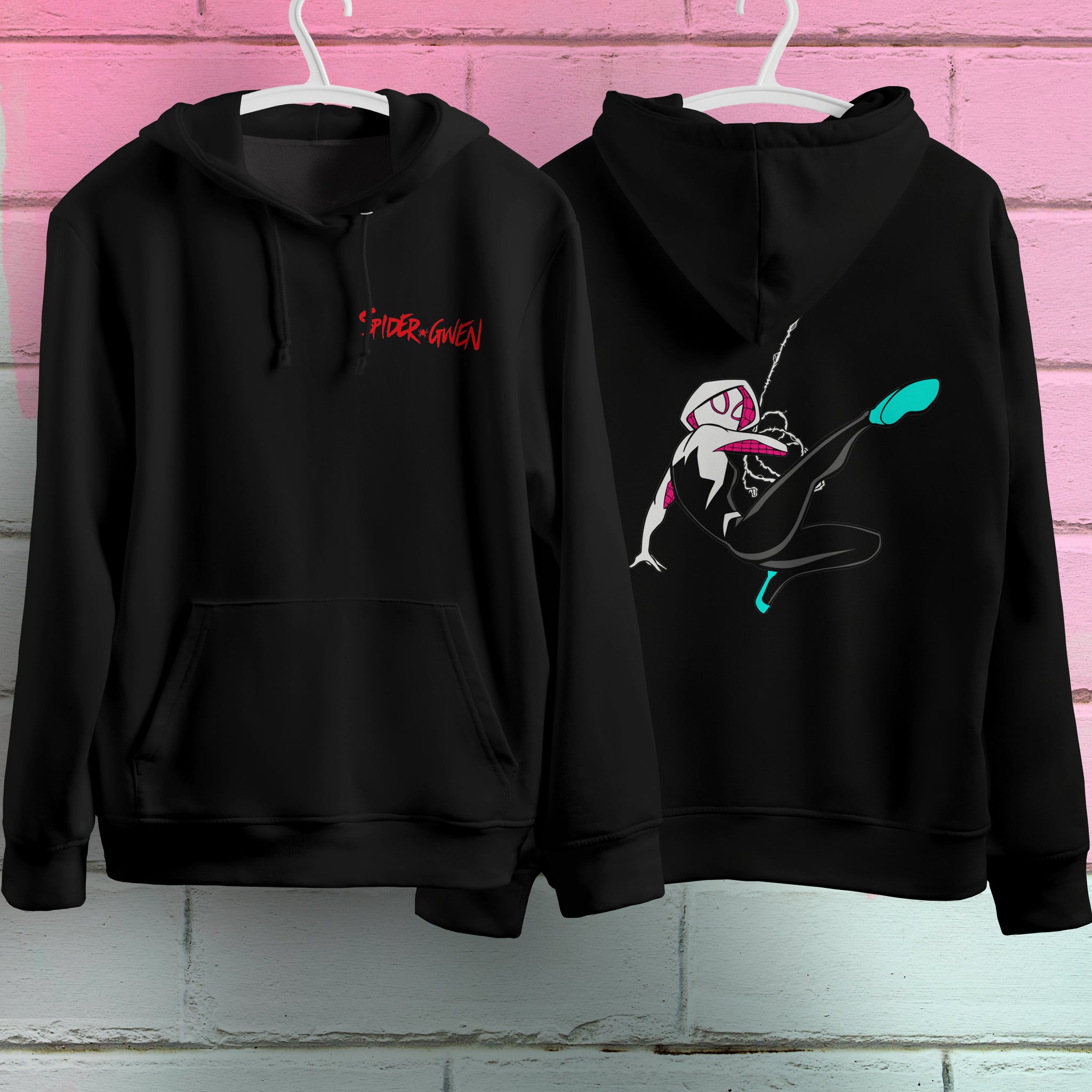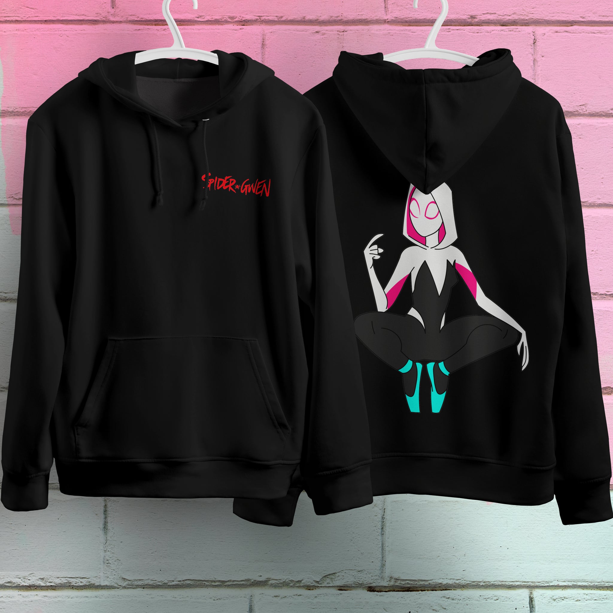 Introducing the Spider Gwen Hoodie - the ultimate blend of casual and fashion-forward clothing. This all-black hoodie features a comfortable long sleeve design and a hooded pullover style, perfect for streetwear lovers looking to add some personality to their wardrobe.
